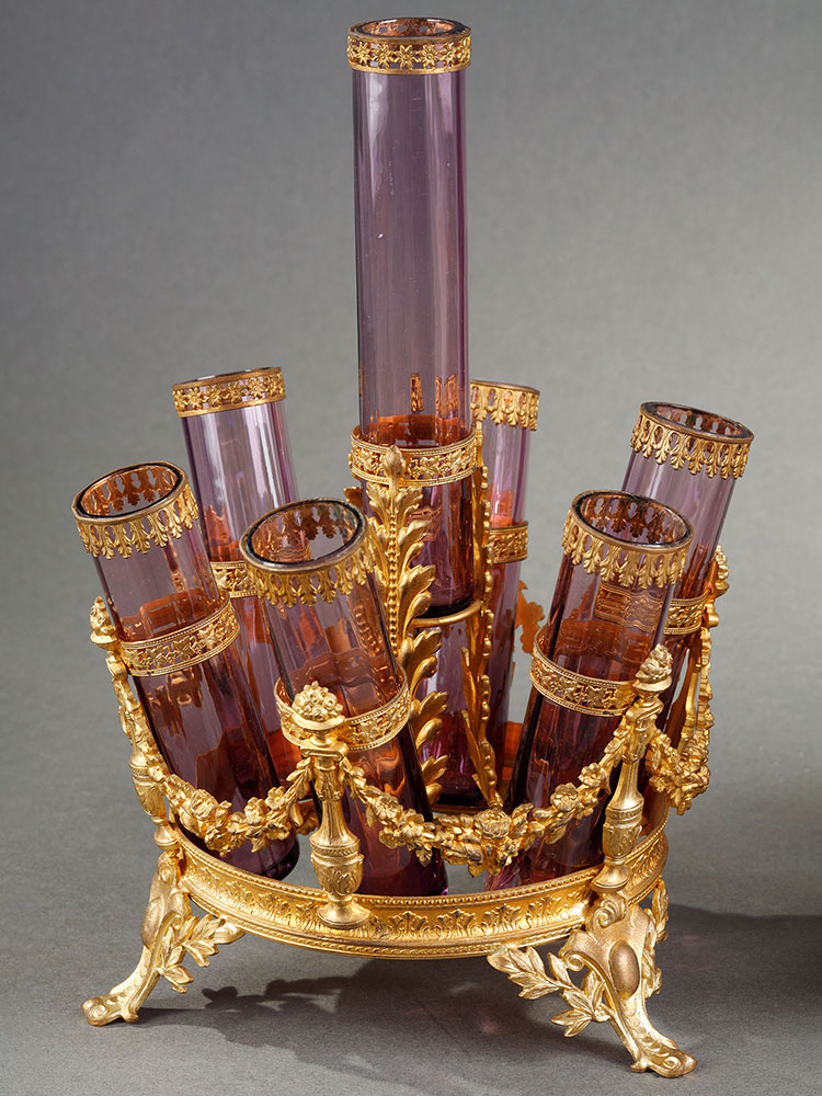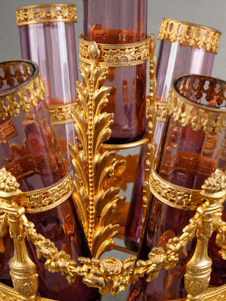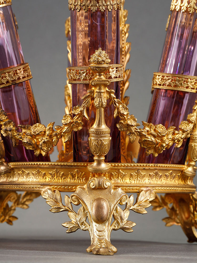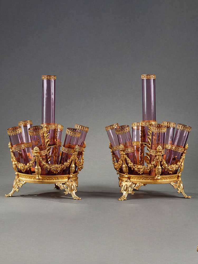 1880年代法国出品帝政风格铜鎏金雕饰“紫罗兰”主题玻璃花瓶摆件一对