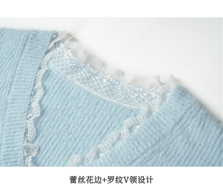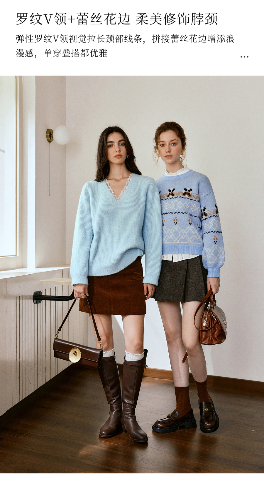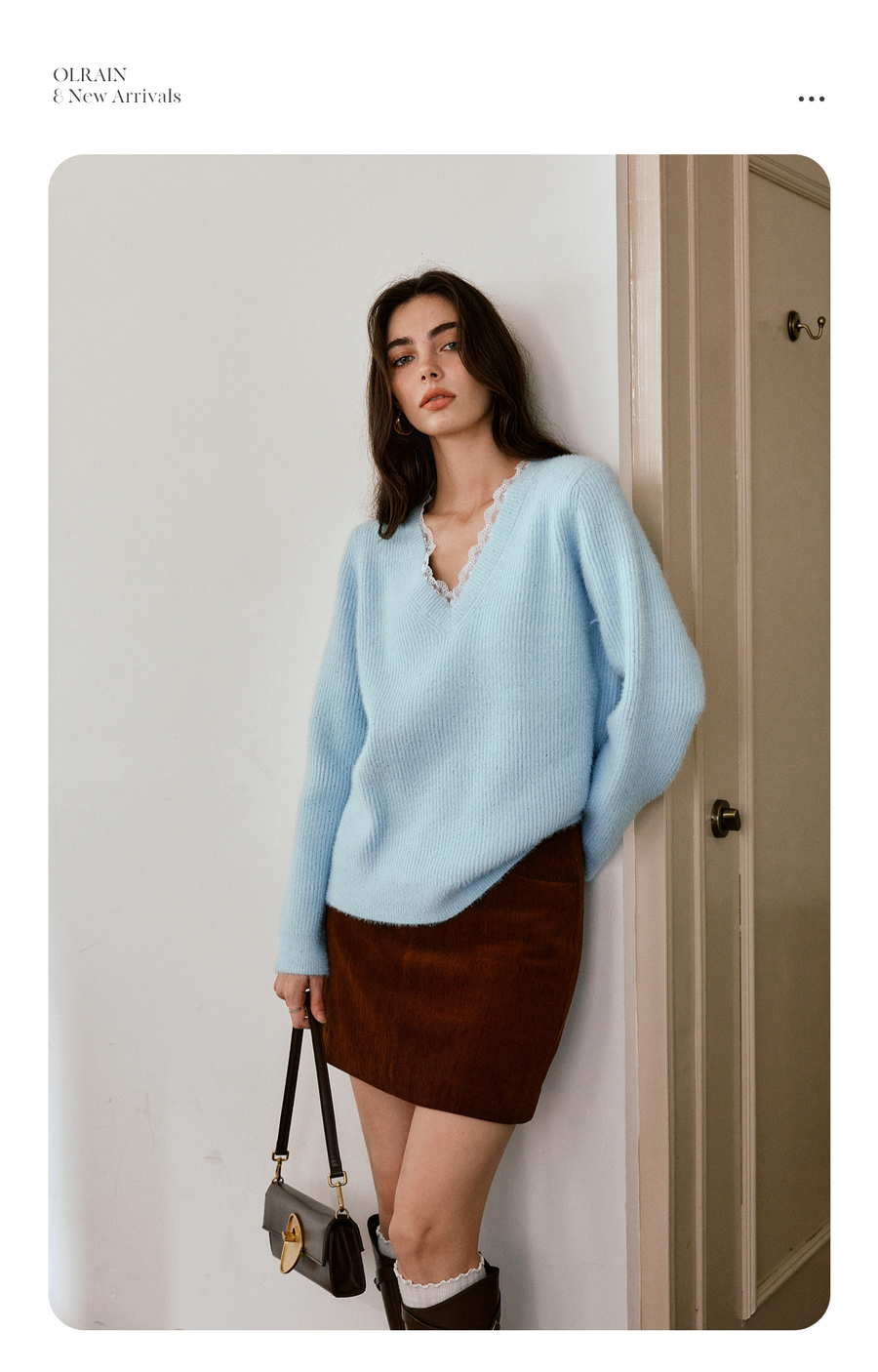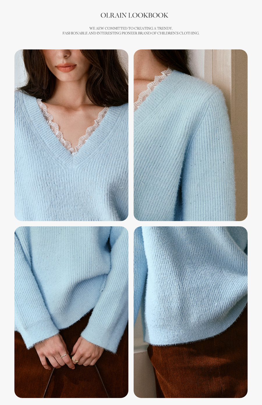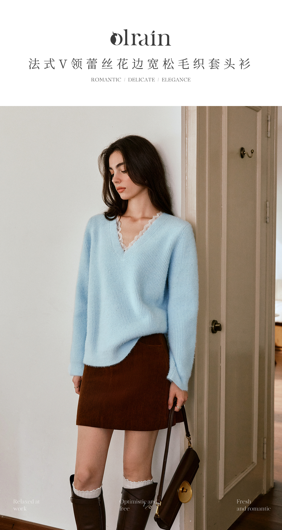 OLrain欧芮儿V领蕾丝花边宽松毛织套头衫秋季2025新款法式上衣