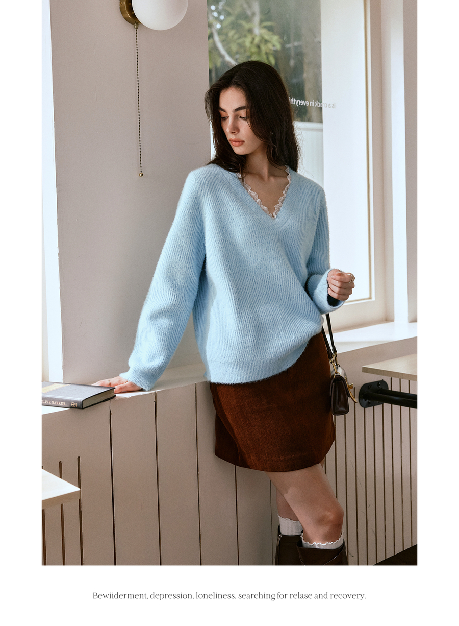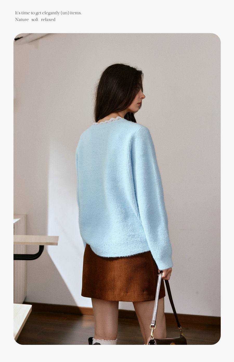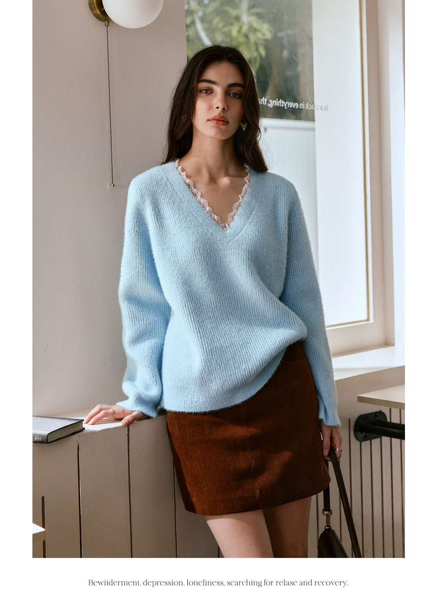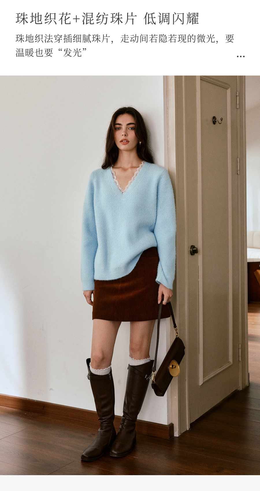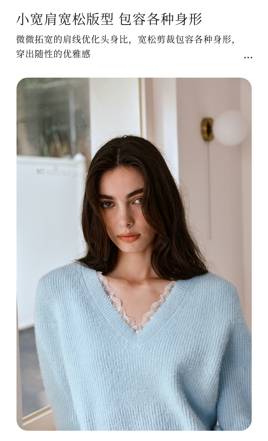 OLrain欧芮儿V领蕾丝花边宽松毛织套头衫秋季2025新款法式上衣