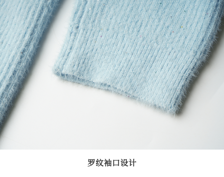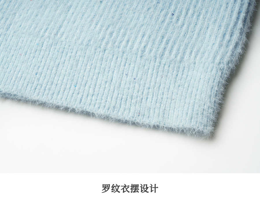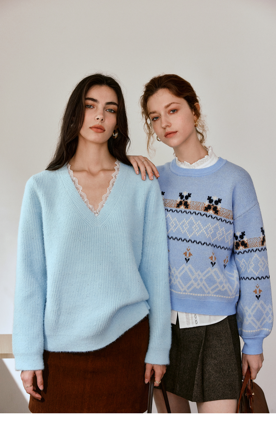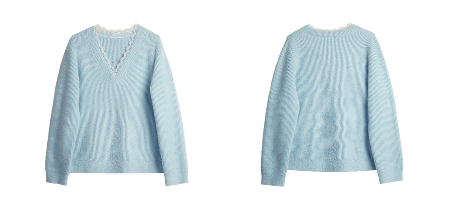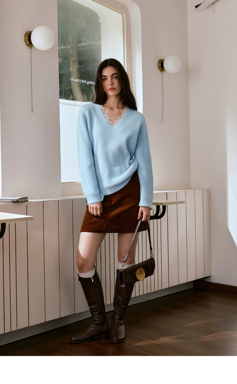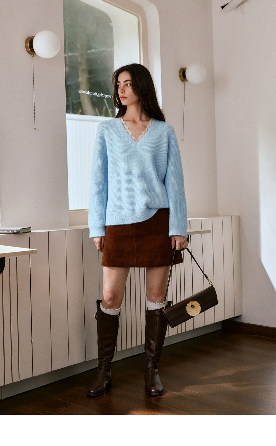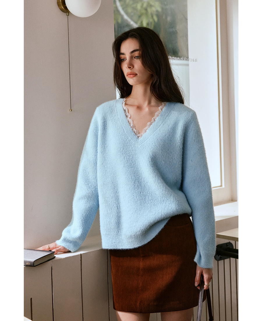 OLrain欧芮儿V领蕾丝花边宽松毛织套头衫秋季2025新款法式上衣