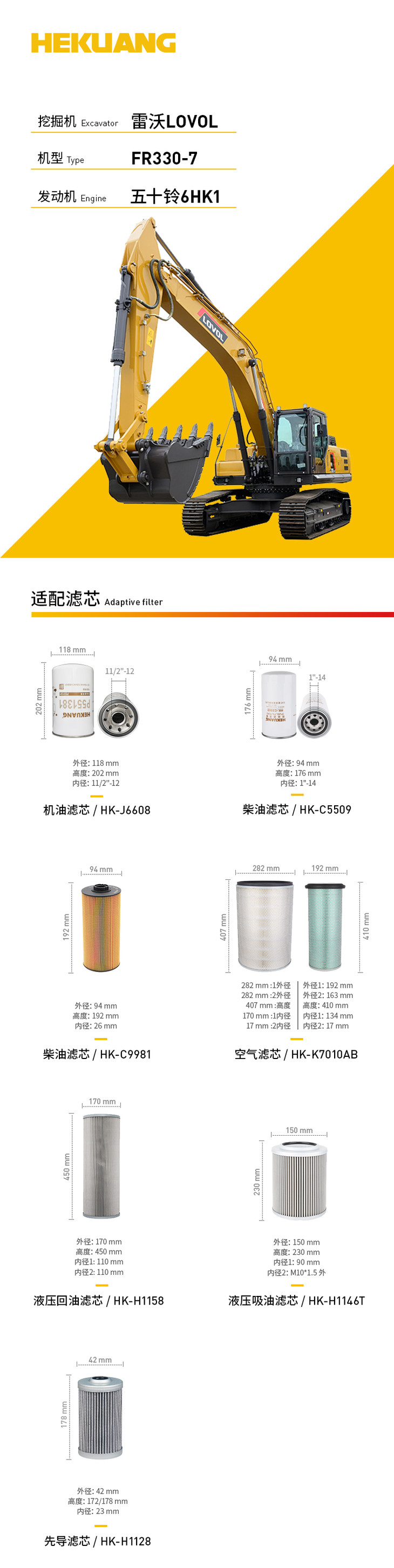 雷沃FR330-7/FR360-7挖掘机滤芯 机油柴油滤芯 液压油吸油回油滤芯 先导滤芯