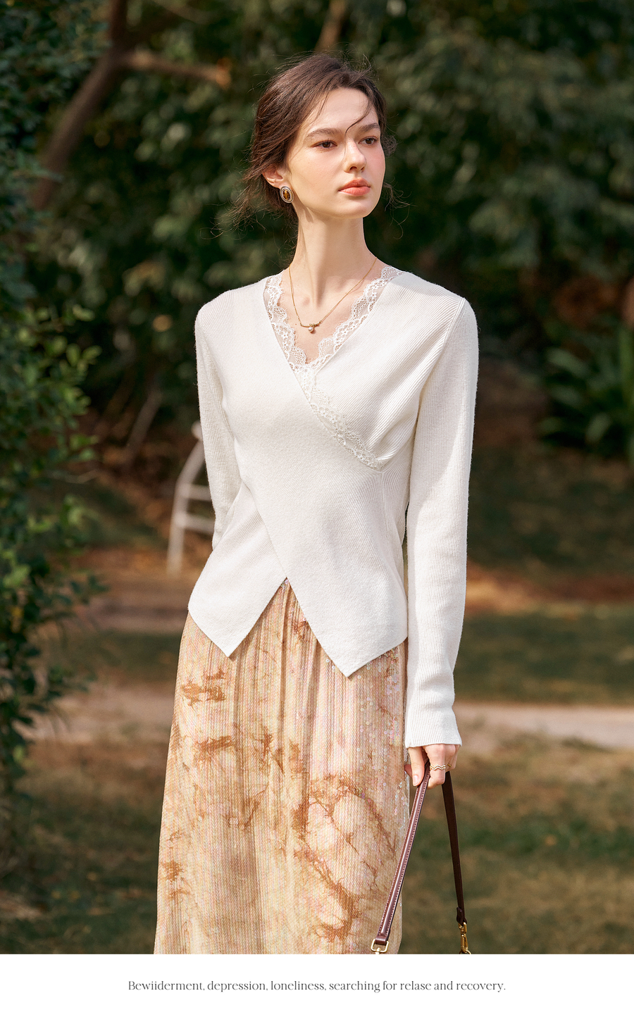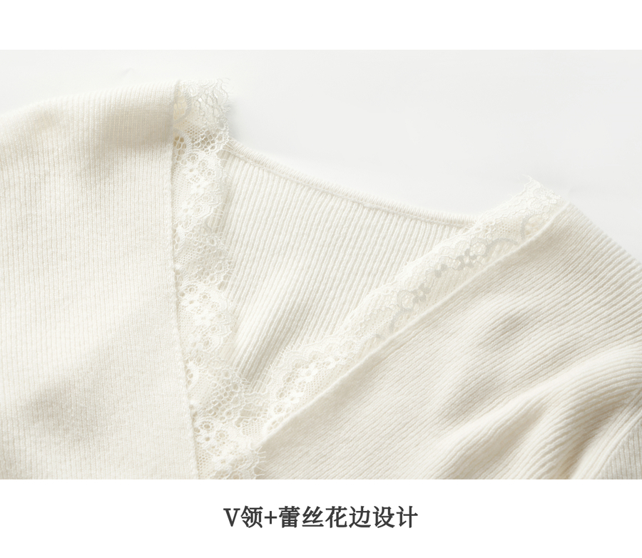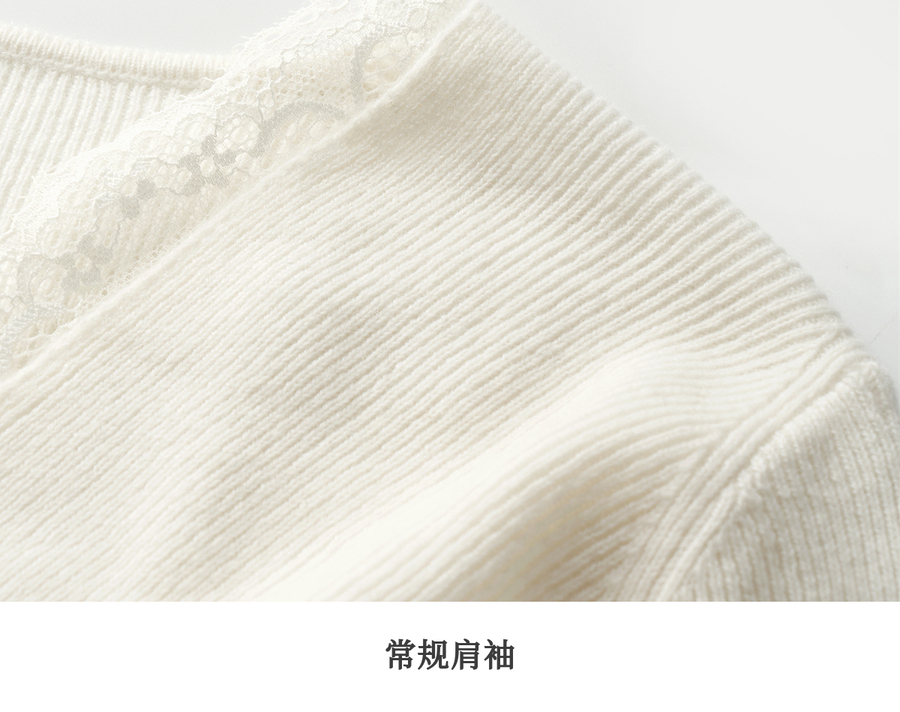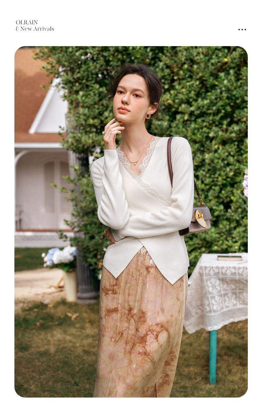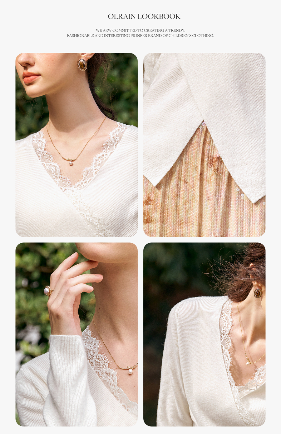 OLrain欧芮儿法式白色针织衫女春季2025年新款收腰拼接蕾丝套头衫