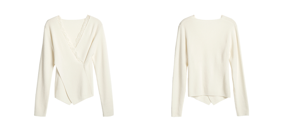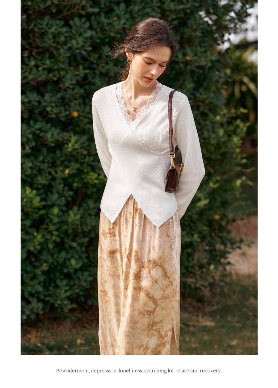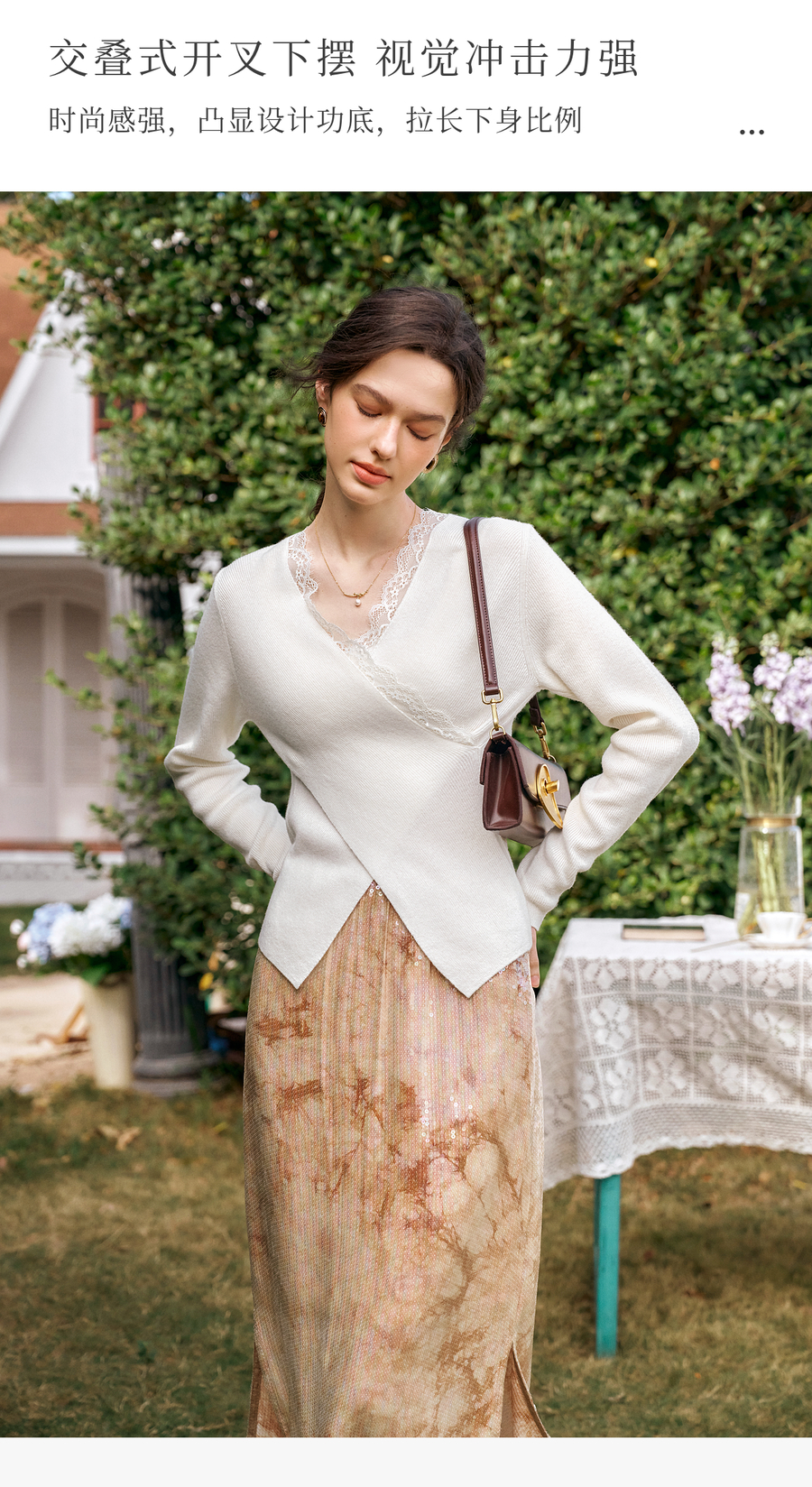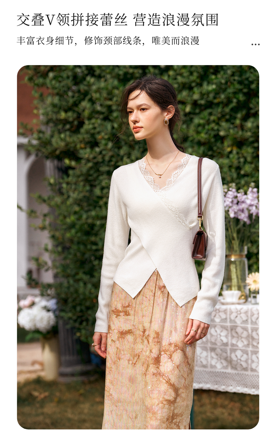 OLrain欧芮儿法式白色针织衫女春季2025年新款收腰拼接蕾丝套头衫