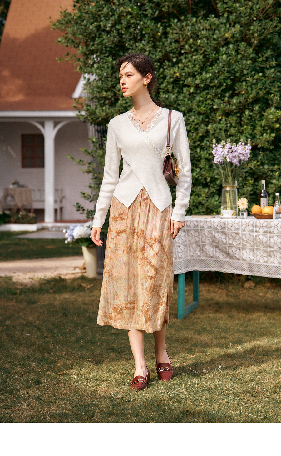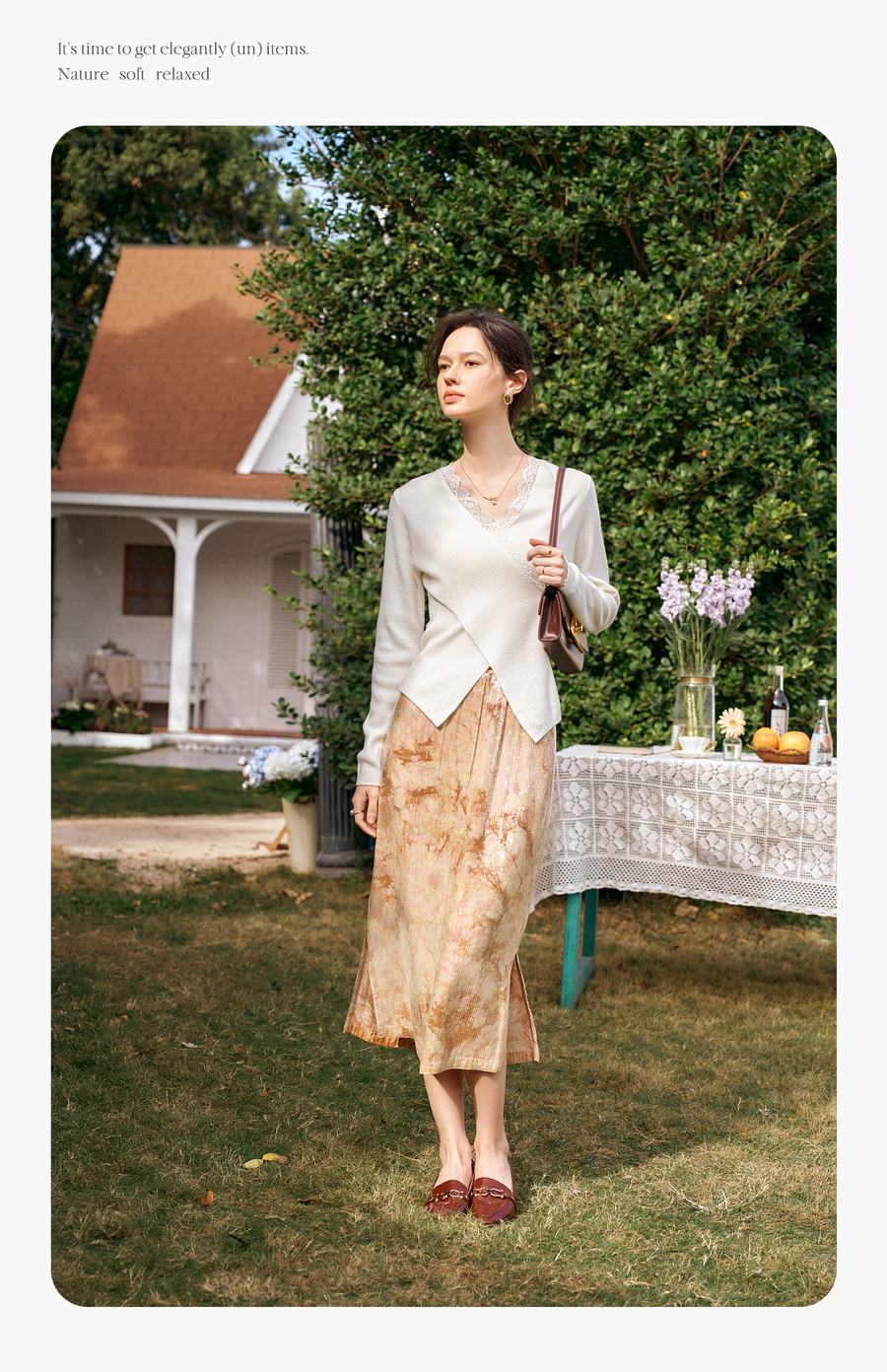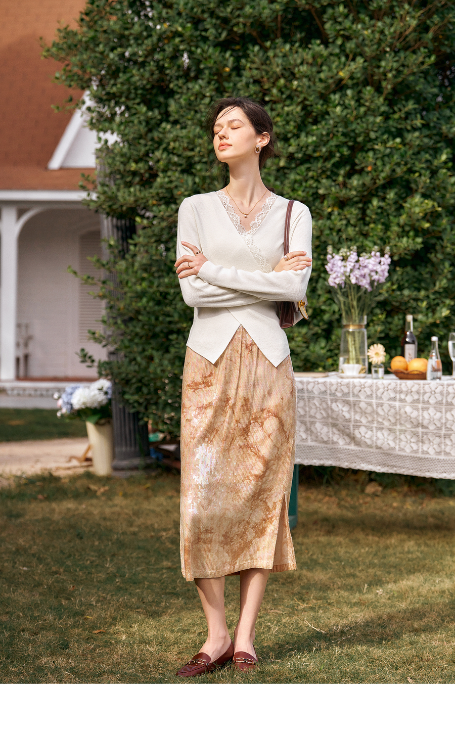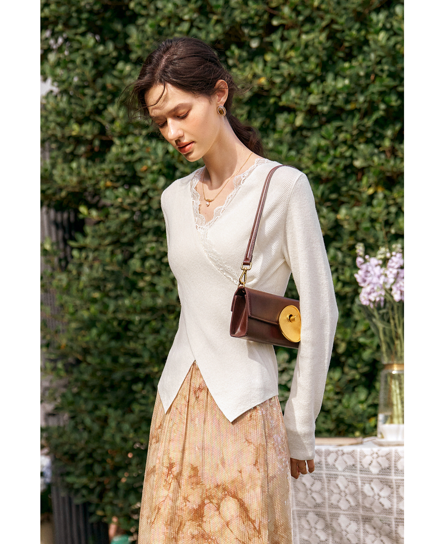 OLrain欧芮儿法式白色针织衫女春季2025年新款收腰拼接蕾丝套头衫