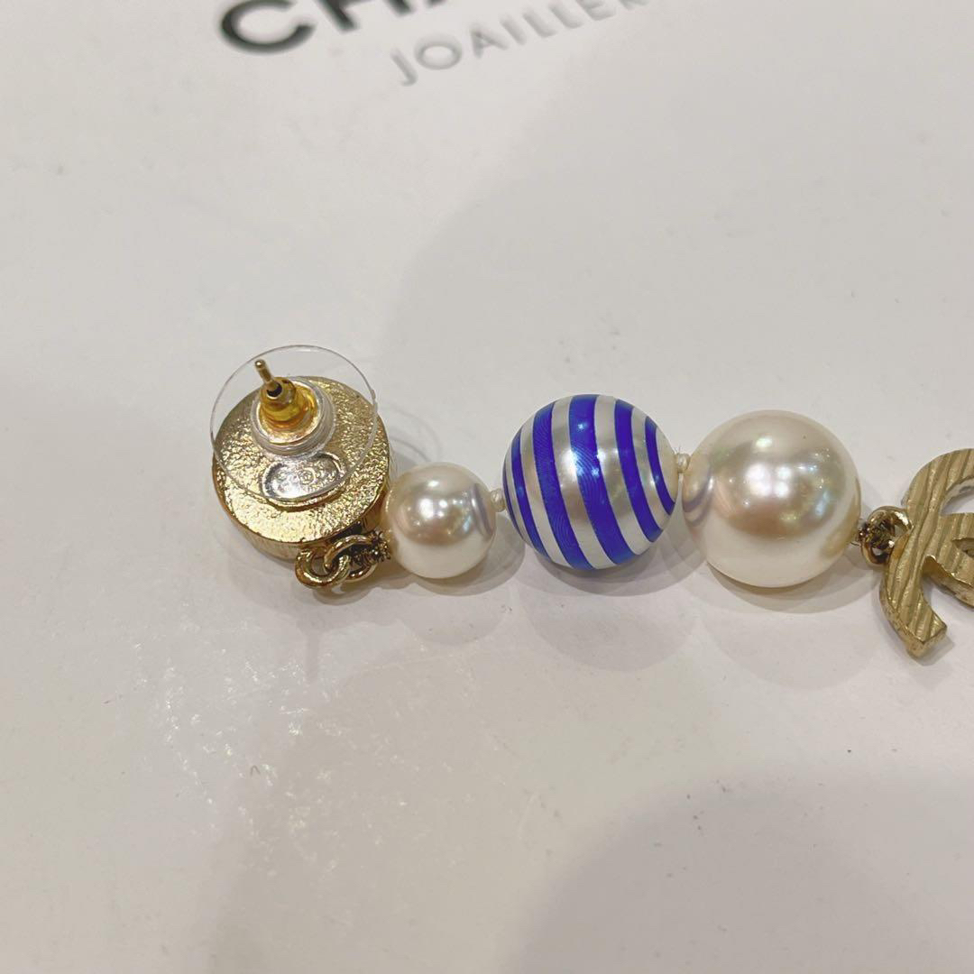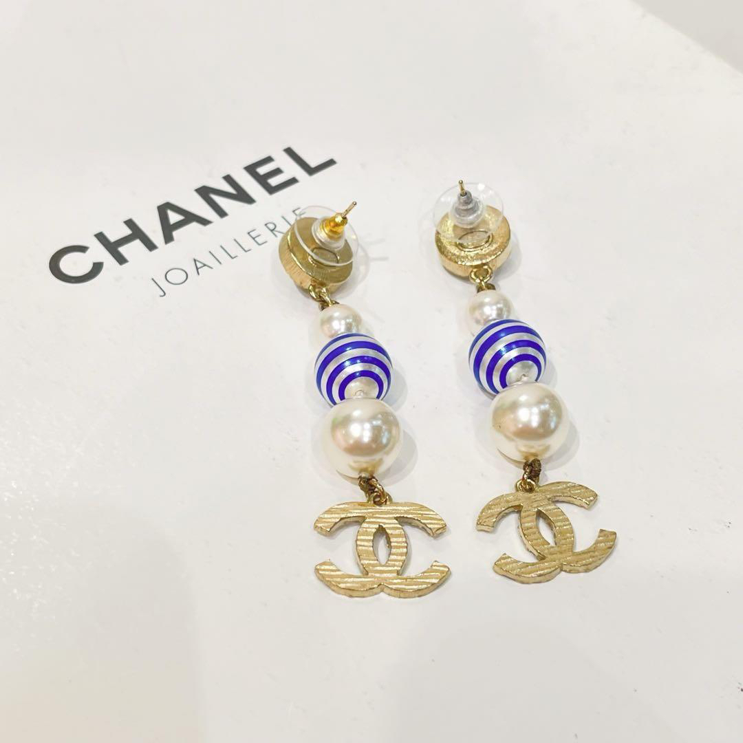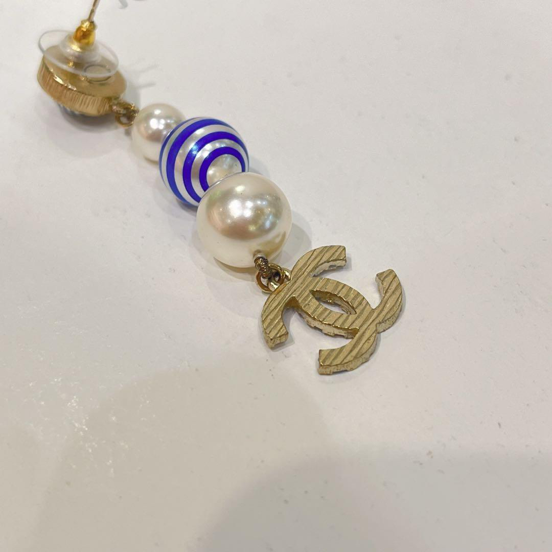 【商品詳情】正品二手 Chanel 海军蓝 条纹 珍珠 双clogo 耳环🍭98新 1x7。复古个性时髦