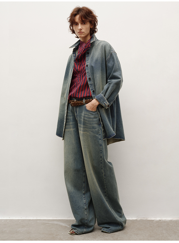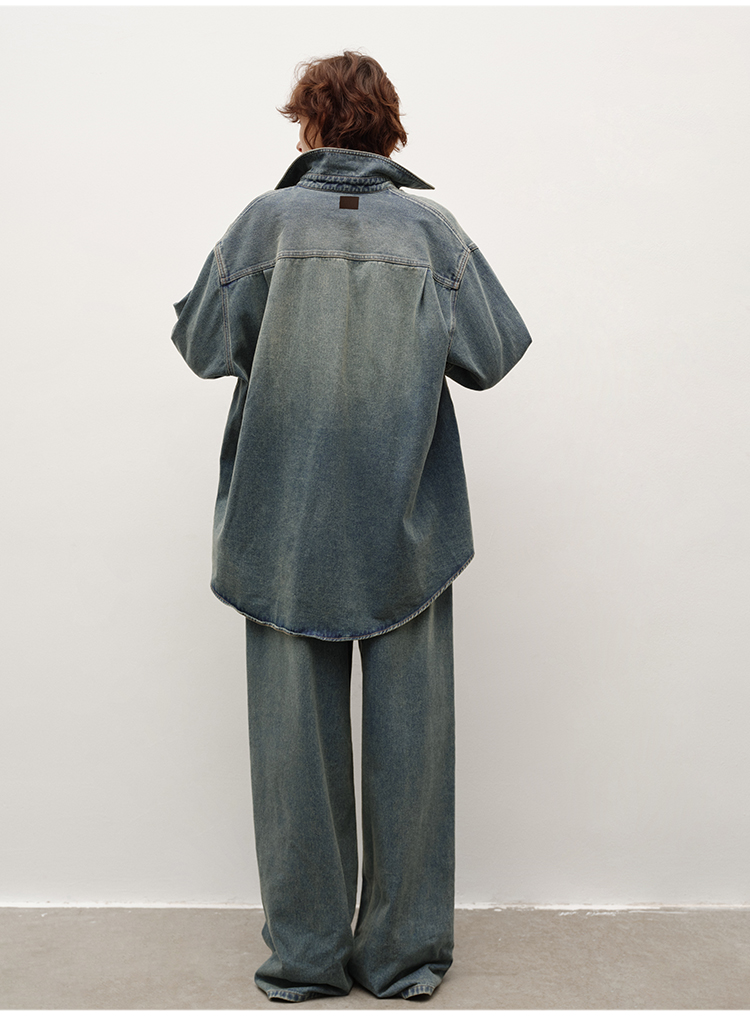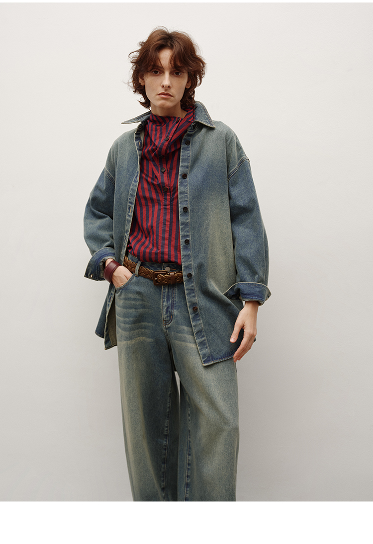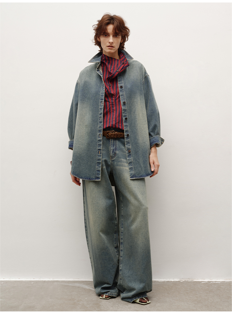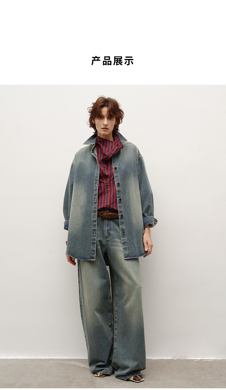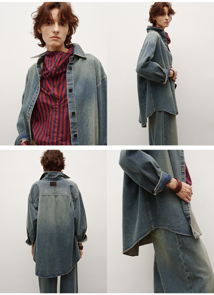 HIDEMI 多重水洗做旧感牛仔蓝泛白丹宁牛仔廓形外套式衬衫