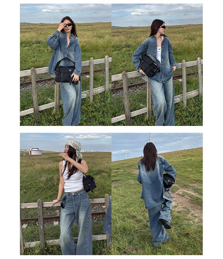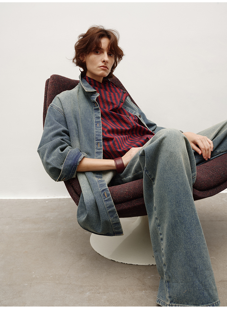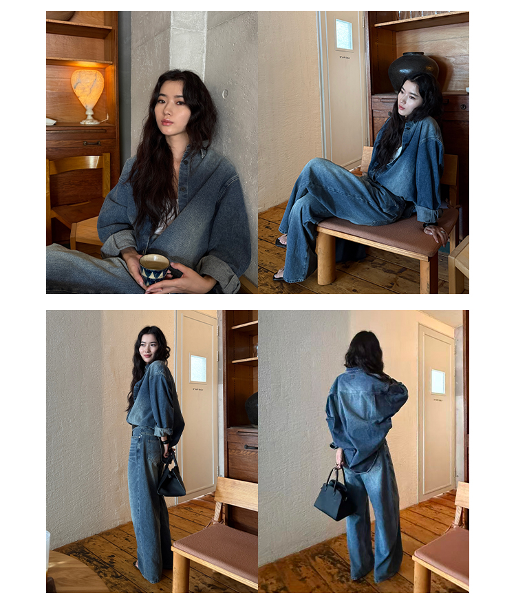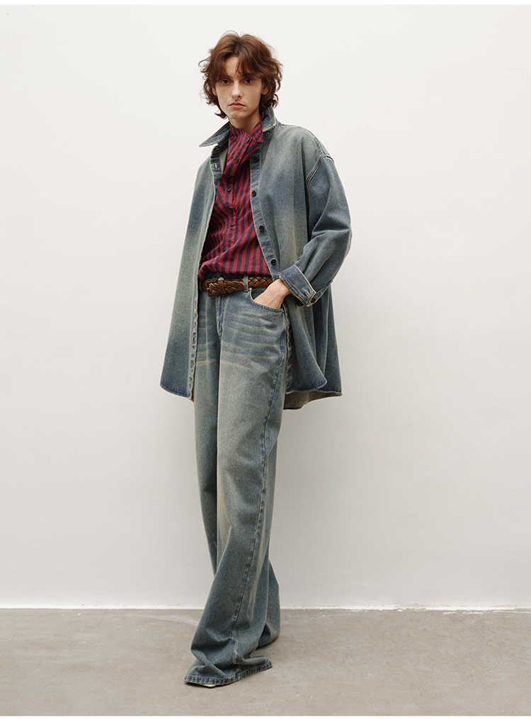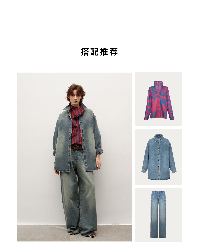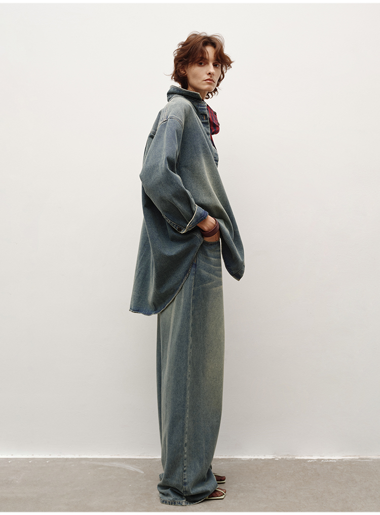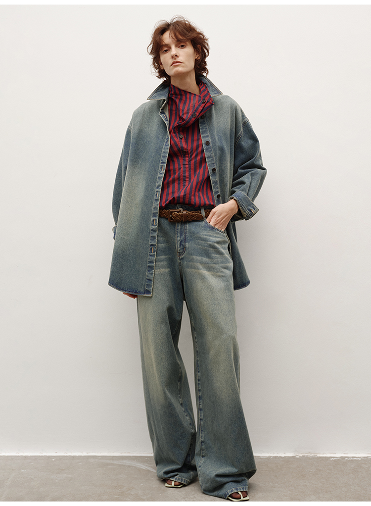 HIDEMI 多重水洗做旧感牛仔蓝泛白丹宁牛仔廓形外套式衬衫