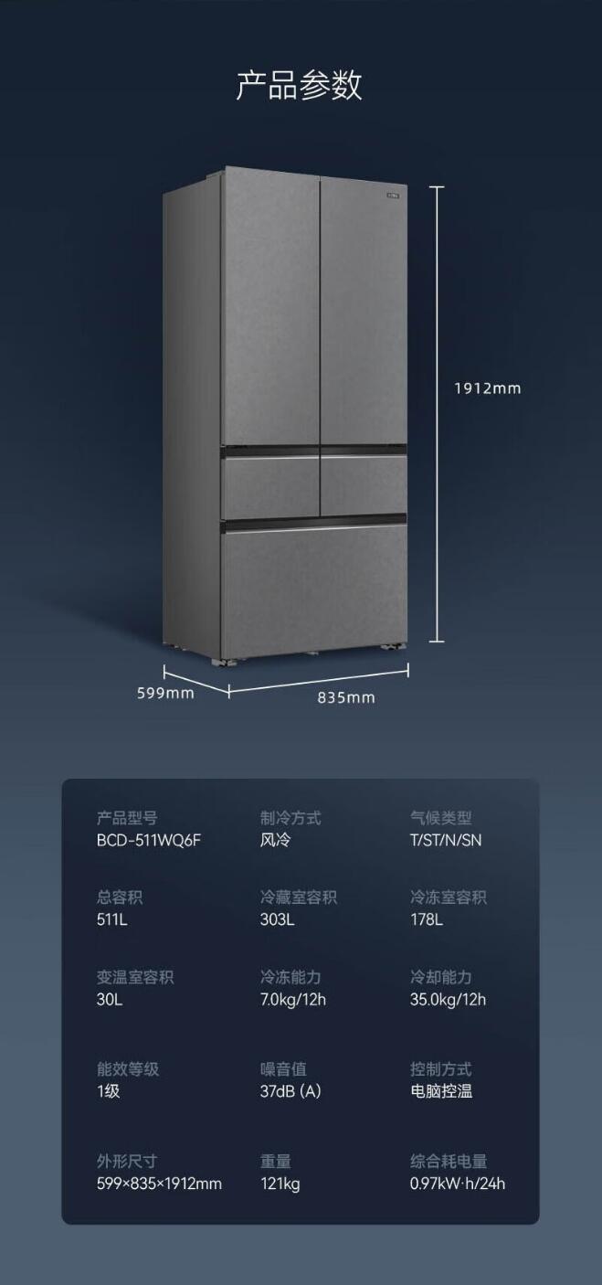 美菱(12406)510\511L法式多门四门超薄嵌入式底部散热风冷无霜一级能效全空间除菌厨房家用电冰箱双变频大容量 BCD-511WQ6F羽墨岩【旋翼变轴零嵌入】