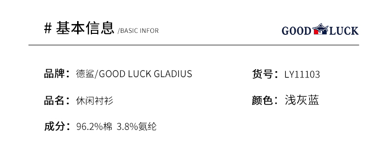 - GOOD LUCK GLADIUS品牌由“浙江德鲨服饰有限公司”引进中国市场,经过多年发展,凭借完善的终端形象,规范化的销售管理,迅速赢得消费者的认可,引领国内消费流行,是成功人士首选男装品牌。