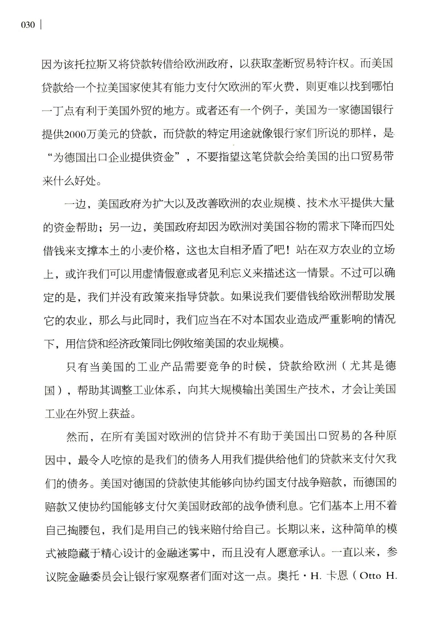 第一个特征,即解决债务的万全之策是信贷。当前的债务规模是从第一次世界大战后开始形成的。毫不夸张地说,假如没有信贷支持,战争无法持续超过4个月;有了信贷的支持,战争得以持续4年之久。是信贷带来了战争的胜利,而胜利的代价是债务数额的惊人增长。欧洲所欠下的战争债既有国内的,也有国外的,而美国的战争债仅限于国内。美国是唯一没有对外举债的参战国,非但没有对外举债,还给欧洲盟国提供了至少100亿美元的借款,相当于它在战争中投入的军费数额。这仅仅是欧洲各国政府欠美国财政部的债务,除此之外,欧洲各国政府之间互相借贷,还向本国人民举债。欧洲各国处理国内外债务的办法是继续借助信贷的帮助,它们请求美国向其提供数额巨大(这一数额在战前是难以想象的)的私人信贷,并且声称除非美国的信贷能帮助其摆脱巨额债务负担,否则将无法偿还欠美国的债务。