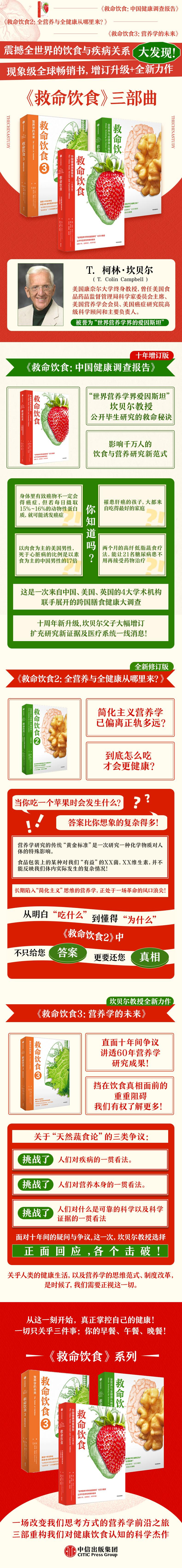 一场由来自中国、美国、英国不同学术机构的科学家联手展开的膳食健康大调查!30多年前,营养学家柯林·坎贝尔教授带领康奈尔大学的团队,与来自中国和英国的团队倾力合作,开始了一项针对饮食和患病风险之间关系的研究。此次调查涉及中国65个县,调查结果契合了坎贝尔实验室的研究结果,令他们看到了高动物蛋白饮食的危险性以及植物性饮食对健康无可比拟的好处。随后,坎贝尔父子在这本书中向世界分享了这些发现。好的营养可以预防早期阶段的疾病,也能阻止或逆转晚期阶段疾病。只要改变饮食习惯,就能大大降低患癌症、心脏病和糖尿病的风险!