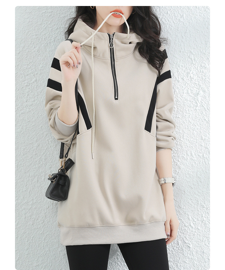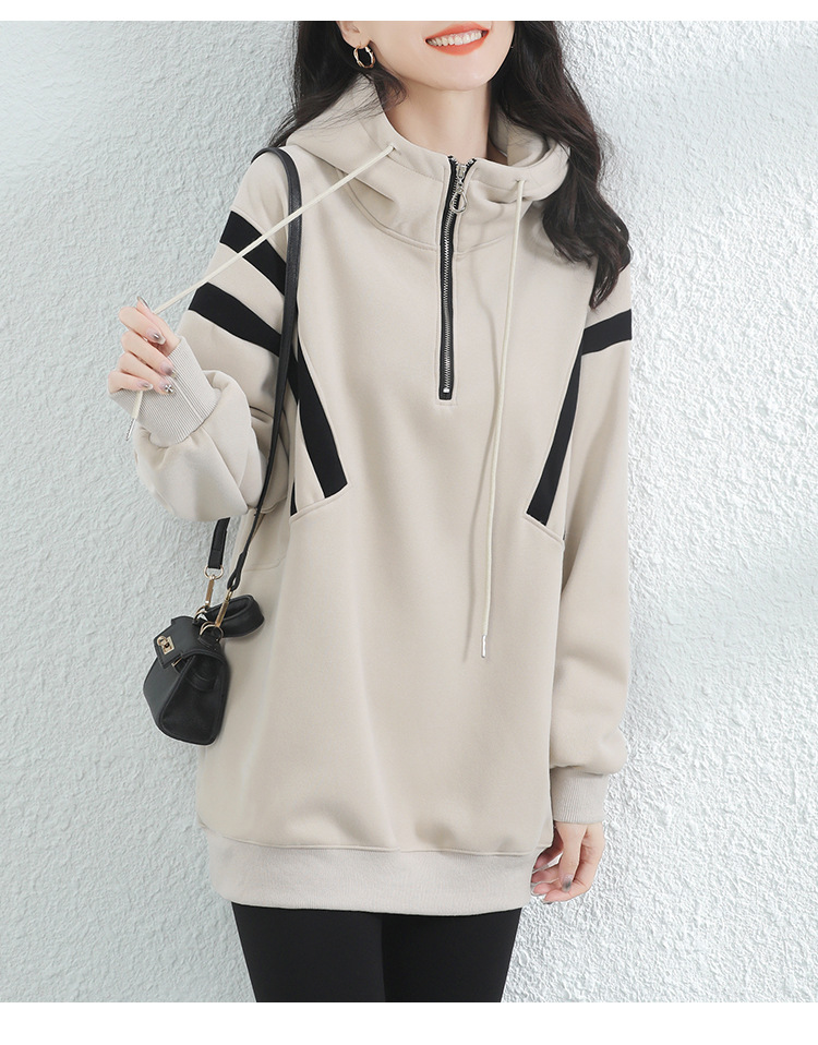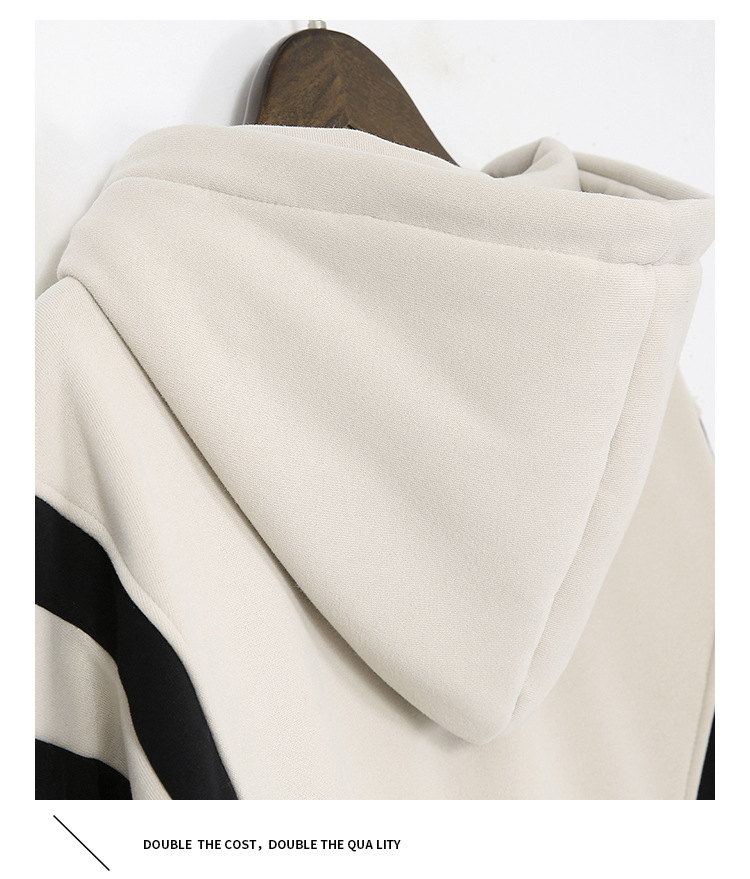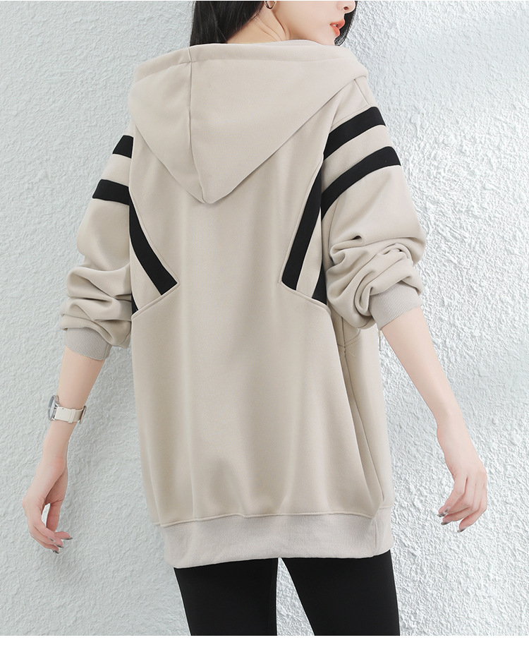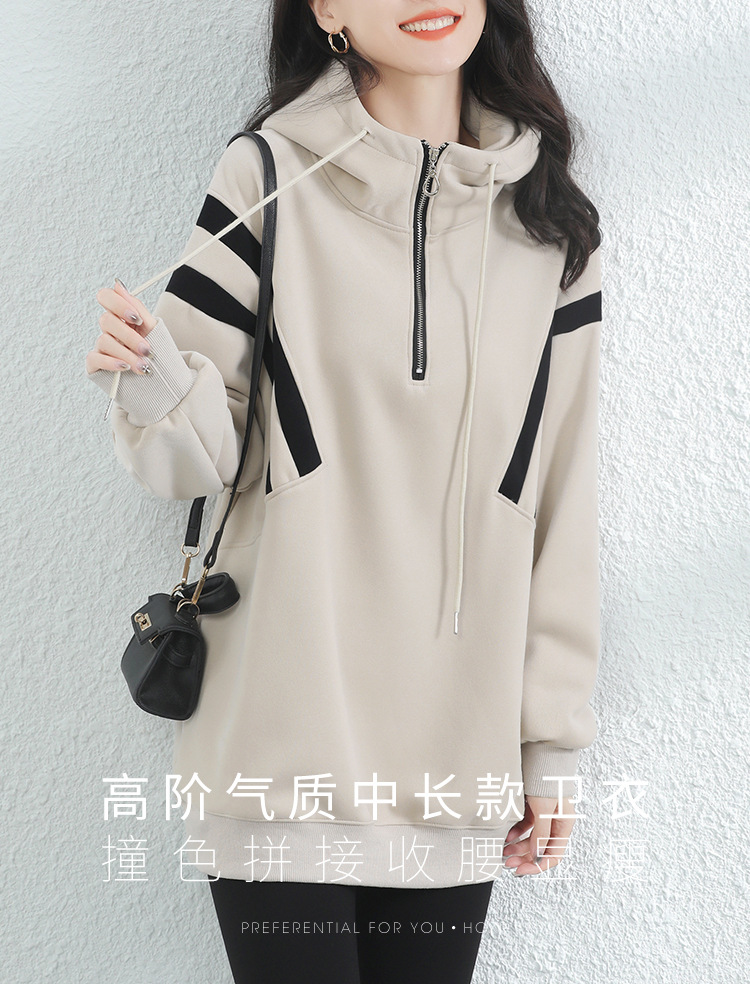 复古撞色连帽中长款加绒卫衣女,冬装新款美式百搭上衣厚 GYM-D0434
