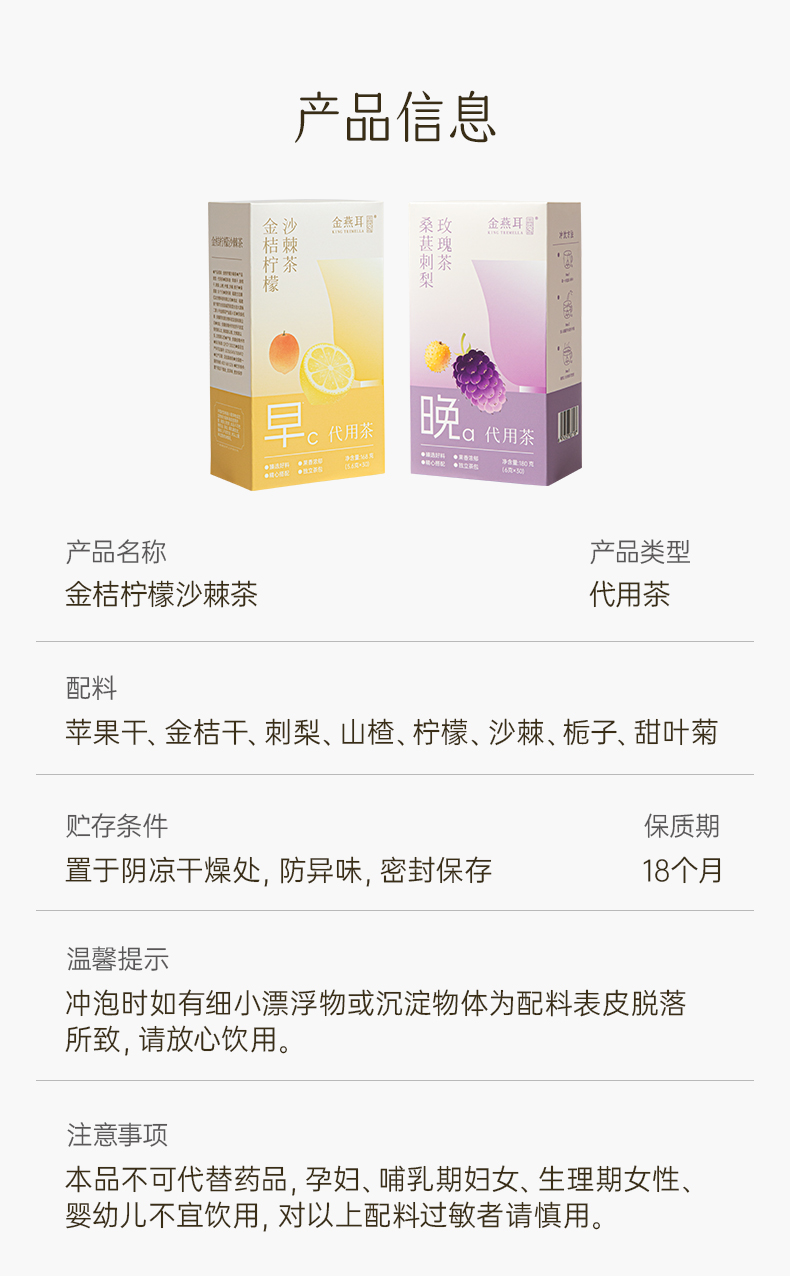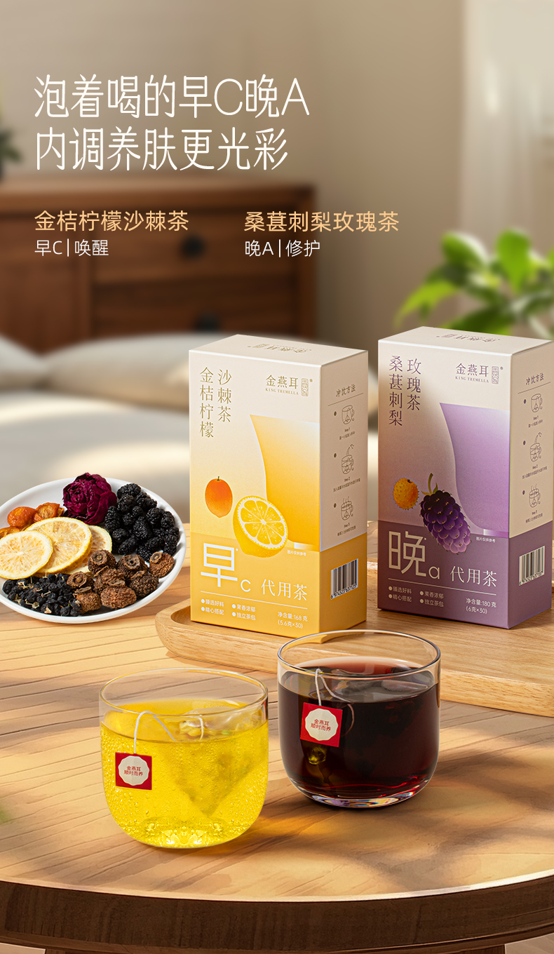 金燕耳 早c晚a茶 金桔柠檬沙棘茶(早C)+桑葚刺梨玫瑰花茶(晚A)冷泡/热饮都可以 30小袋/盒