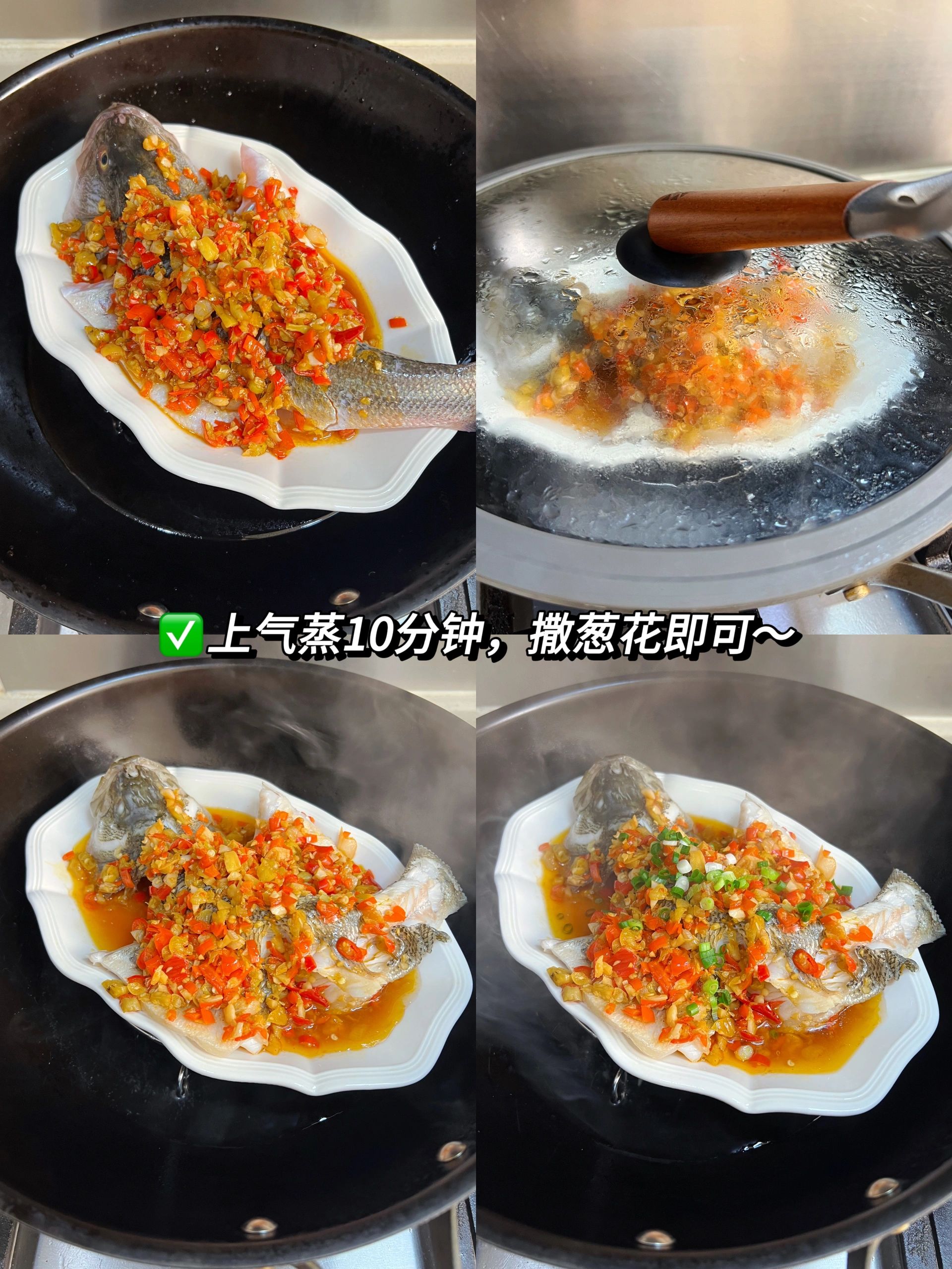 2、把炒好的料倒入鱼身上,水开上气蒸10分