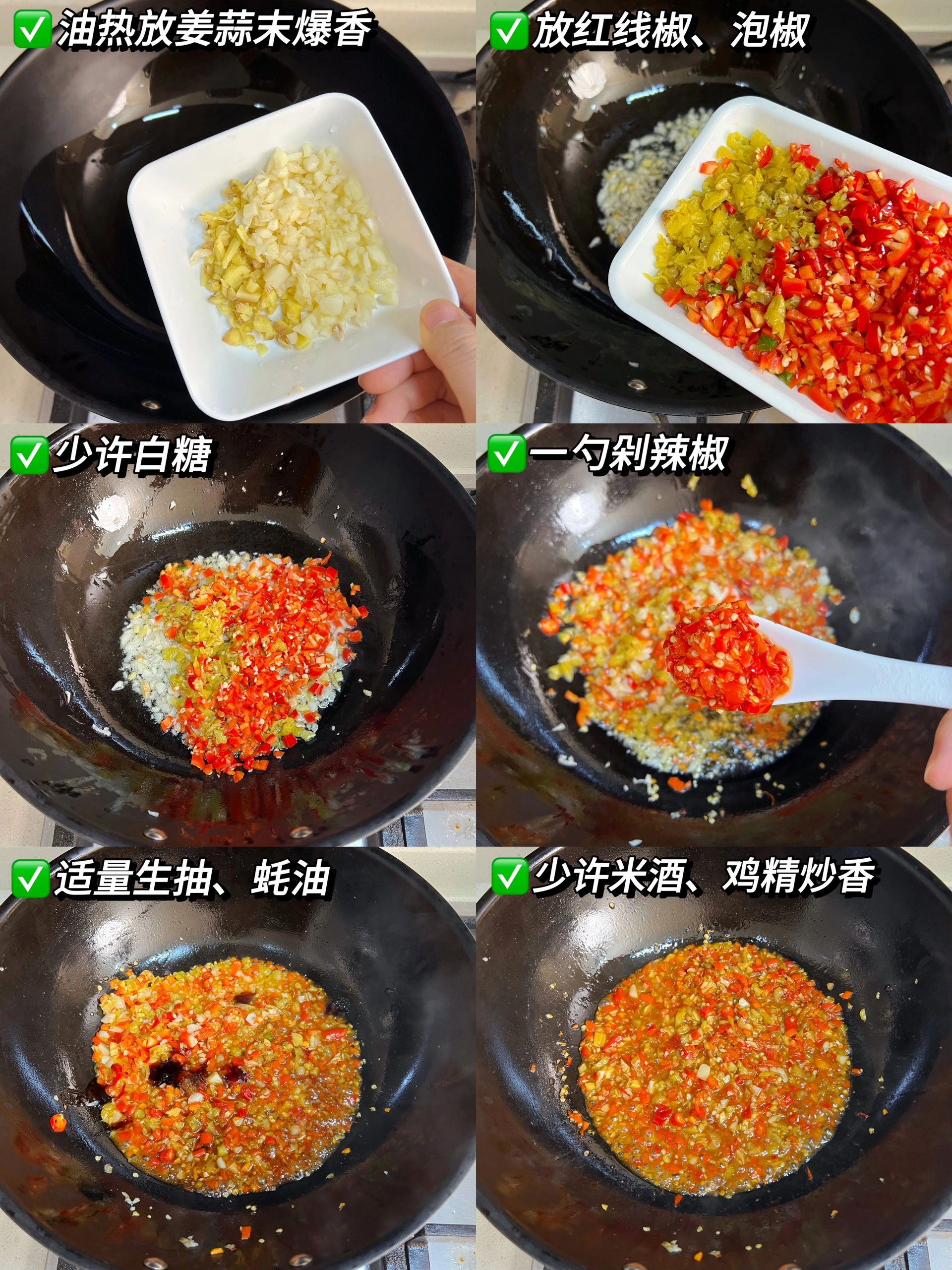 1,油热放姜蒜末爆香,再倒入红辣椒、泡椒、剁辣椒末炒香,放适量生抽、蚝油、白糖、米酒、鸡精炒匀料汁;