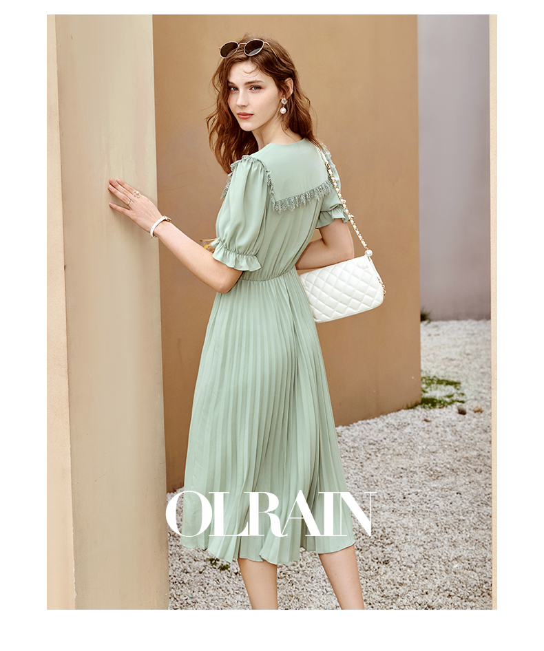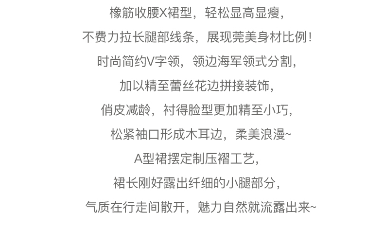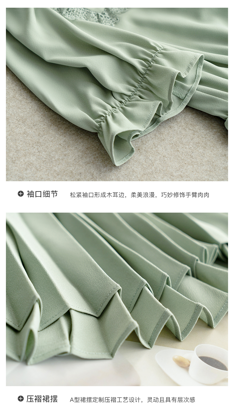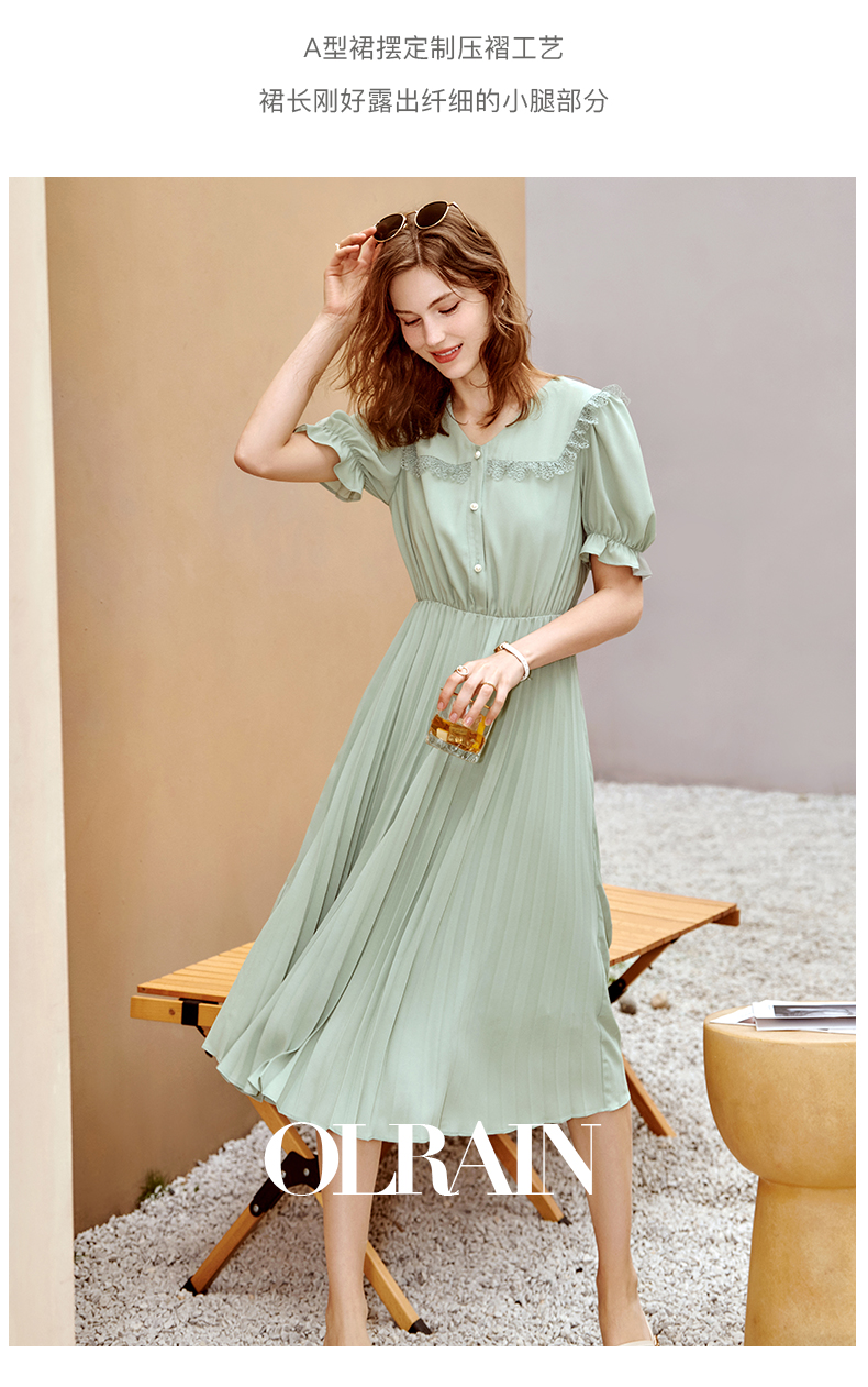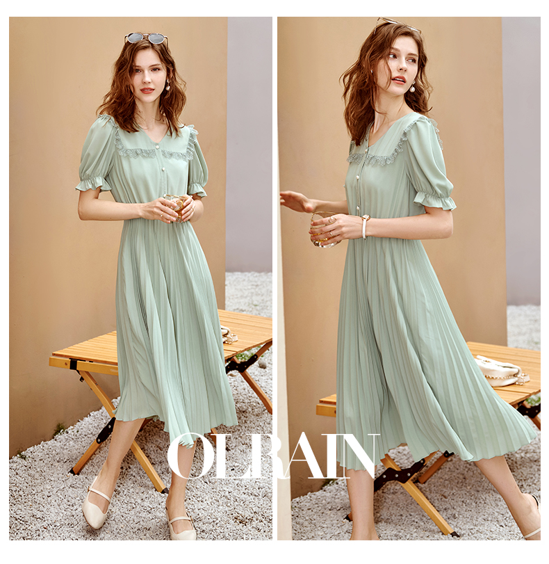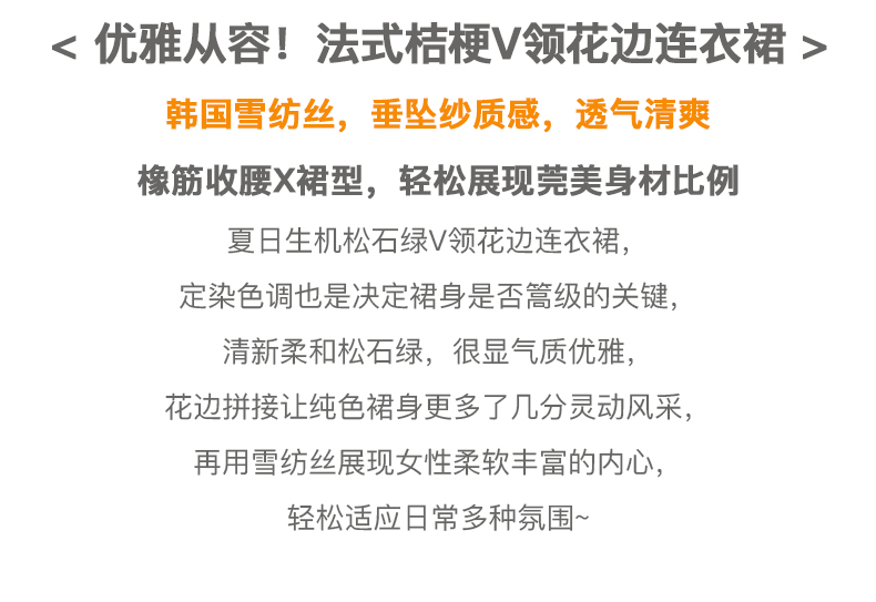 欧芮儿雪纺连衣裙2021夏收腰显瘦气质V领花边法式拼接时髦桔梗裙