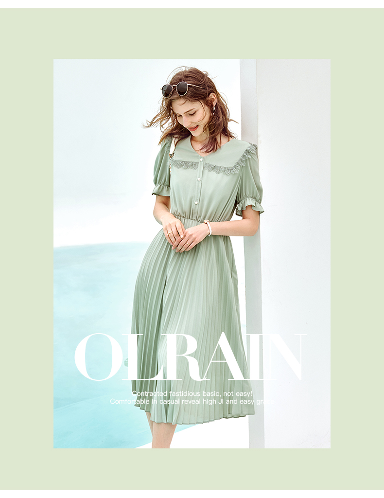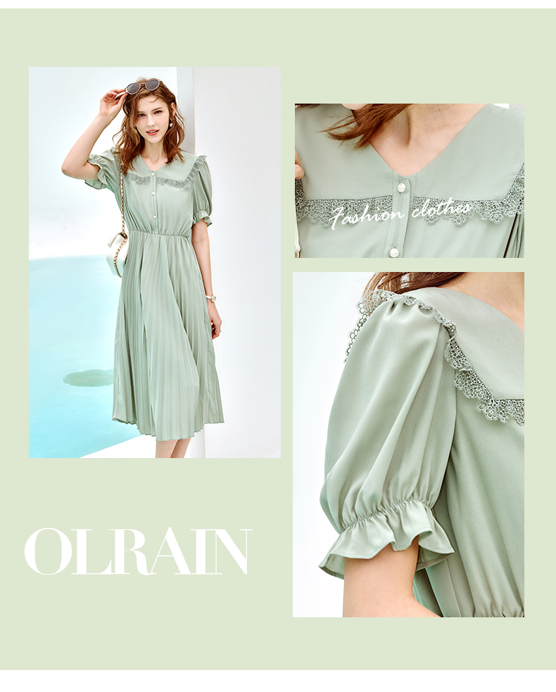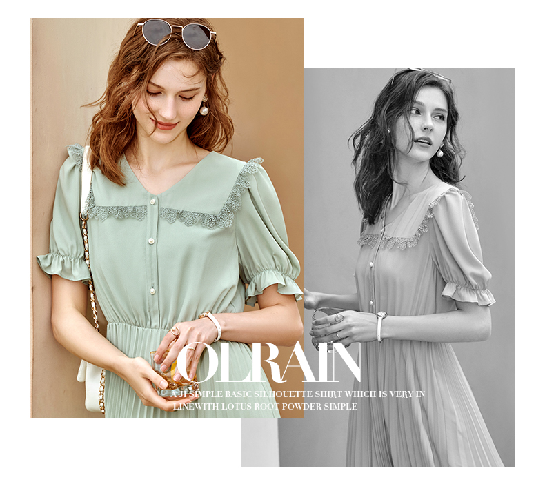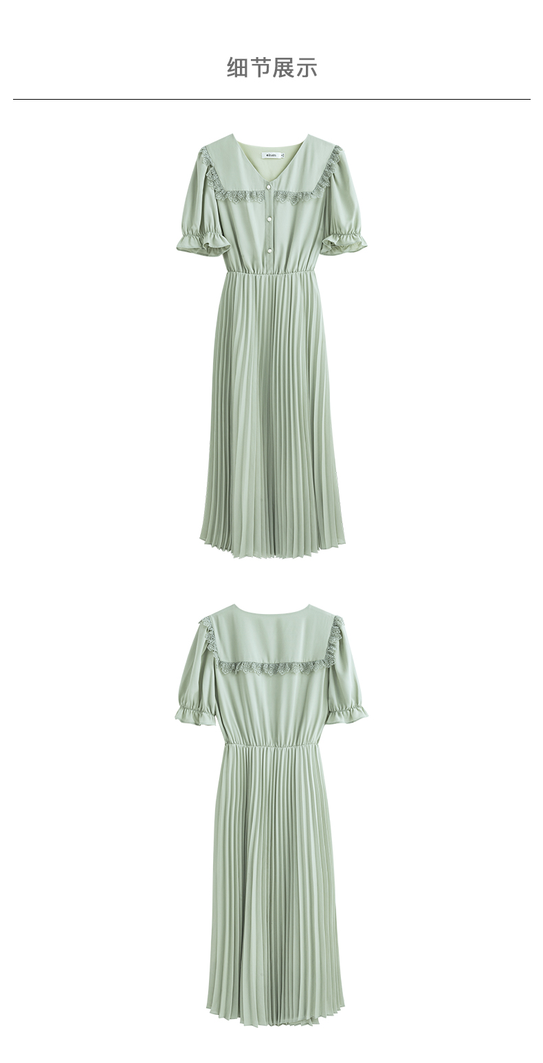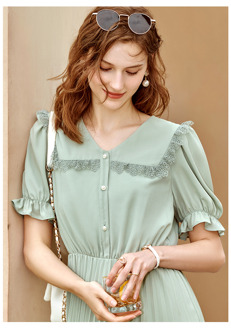 欧芮儿雪纺连衣裙2021夏收腰显瘦气质V领花边法式拼接时髦桔梗裙