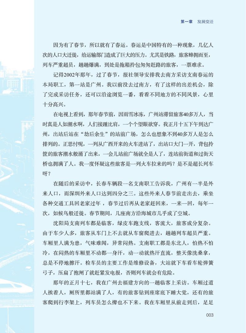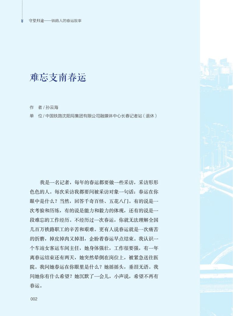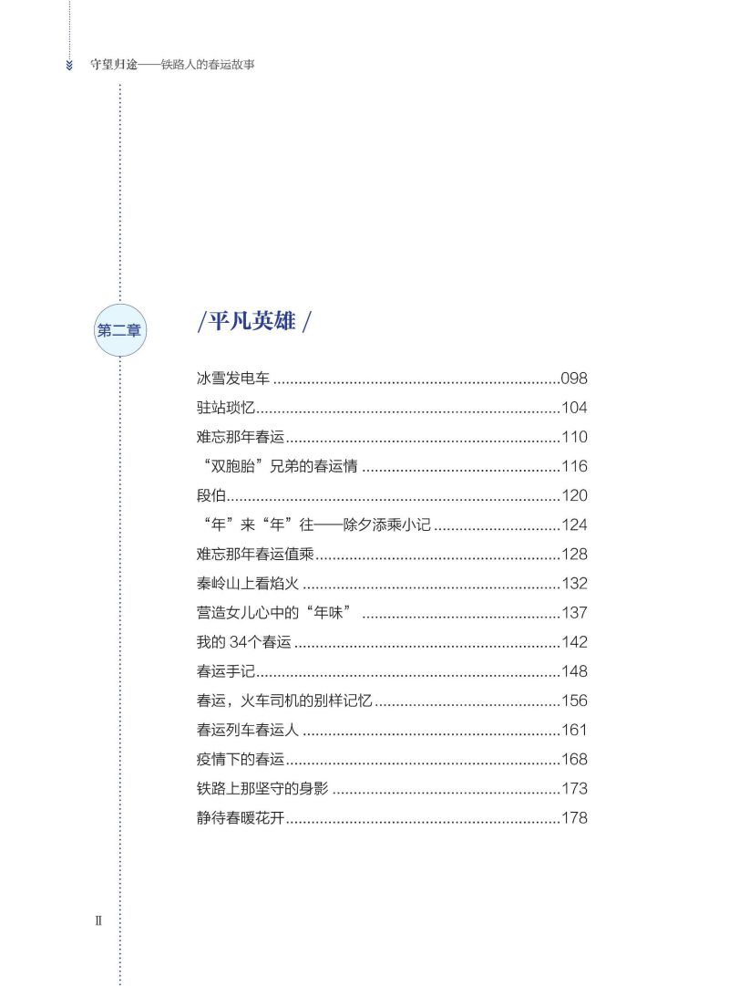 铁路春运,事关亿万人民、千家万户的幸福团圆,牵动千家万户和全社会的神经,充满不同年代铁路职工与旅客的情感与记忆。为了更好地记录与传承铁路春运文化,展现春运变迁给旅客出行带来的变化,反映铁路发展尤其是高铁在为广大人民群众创造美好生活所起的作用,中国铁道出版社有限公司和中国铁路文联作家分会在全路范围内开展了主题为“我和春运的故事”的文学征文活动。本书将此次活动的优秀作品汇集成册,紧扣“铁路人的春运故事”这一主题,通过发展变迁、平凡英雄、温馨旅程三个篇章42篇文章,讲述了铁路春运中发生的各种真实感人的故事,展现了铁路改革发展取得的巨大成就,体现了铁路努力营造美好出行方式、与人民群众共创美好生活的追求和目标。