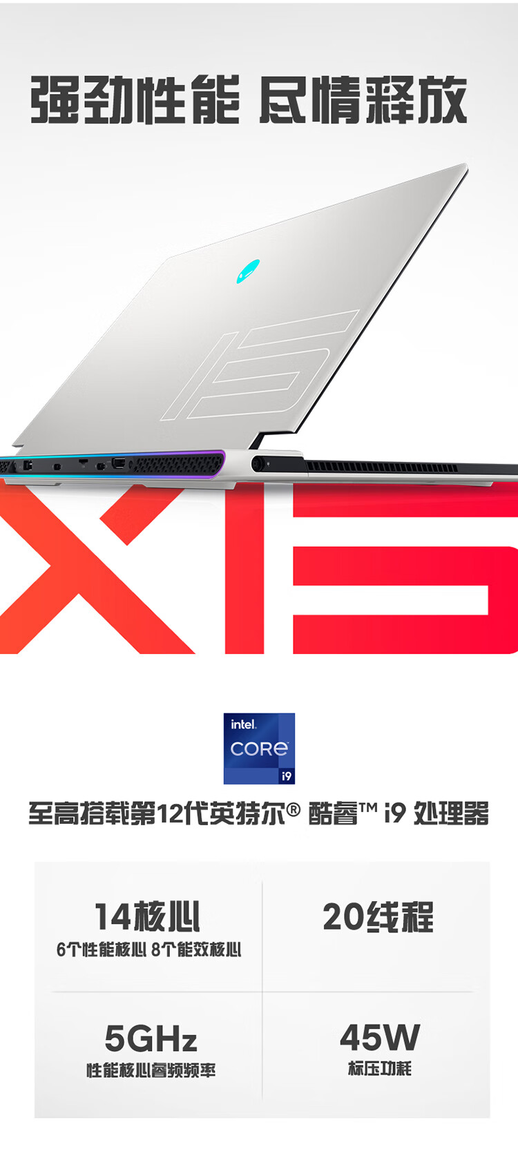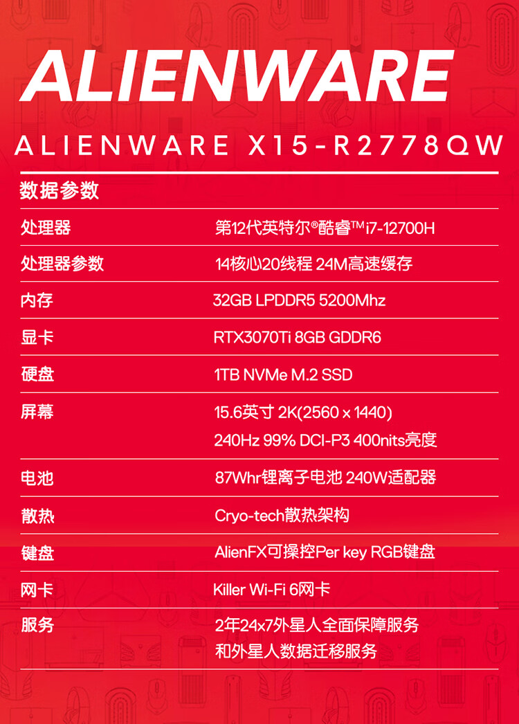 外星人ALIENWARE x15R2 15.6英寸高端游戏本12代i7 32G 1T RTX3070Ti 2K 240Hz高刷屏轻薄笔记本电脑2778QW