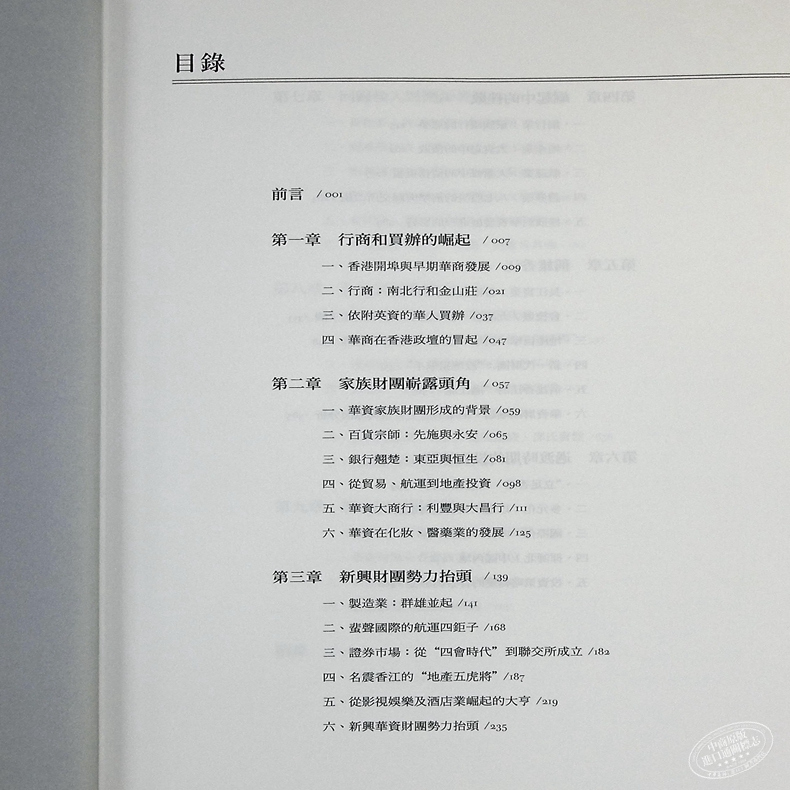 本書就是以這特定內涵為前提,來研究香港華資財團的,並試圖從歷史與經濟相結合的角度,對香港華資財團由萌芽、形成、崛起以至稱雄的整個歷史進程,作出客觀、平實的概述和剖析。全書共分九章:第一、二章“行商和買辦的崛起”和“家族財團嶄露頭角”,概述了香港開埠首一百年間華資財團的萌芽、形成、發展及其歷史背景。第三、四章“新興財團勢力抬頭”和“崛起中的挫敗”,敘述了新興華資財團隨著香港的工業化和經濟起飛,在工業、航運、地產及其他行業相繼崛起,於香港經濟中的整體勢力迅速提升,以及局部的挫敗對華資財團長遠發展的影響。第五章“稱雄香江”,重點描述了20世紀70年代末至80年代中後期新興華資財團打破英資的長期壟斷、稱雄香港的歷程,剖析了這種急遽轉變背後所深藏的政治、經濟等種種客觀及主觀因素。第六章“過渡時期的投資策略”,考察了進入過渡時期以後香港華資大財團的主要投資策略及其轉變,這種轉變的時代背景及其對香港經濟的影響。第七、八章“回歸後大財團新發展”和“新進展與新動向”,重點考察了香港回歸中國20年來華資大財團的新發展、新策略,以及這一時期華資在香港各個主要經濟領域的新進展與新動向。第九章“歷史回顧與前瞻”,是全書的總結,在簡要回顧香港華資財團演變、發展的全過程之後,重點分析了華資及華資財團在香港經濟中的地位、作用與特點;華資家族企業經營管理模式的基本特點及利弊,最後作發展前瞻,剖析華資及華資財團在新的歷史發展階段所面對的挑戰,以及未來的發展機遇。