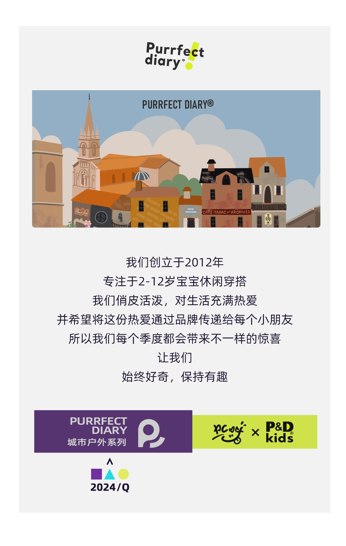 - Purrfect-Diary专注于贴近自然随性的穿着概念,轻奢平价的童装文化传播,在产品设计上更加注重婴童穿着的舒适性、安全性、更出众的国际化品牌,将欧美的育婴文化在中国进行深入的传播与推广。
