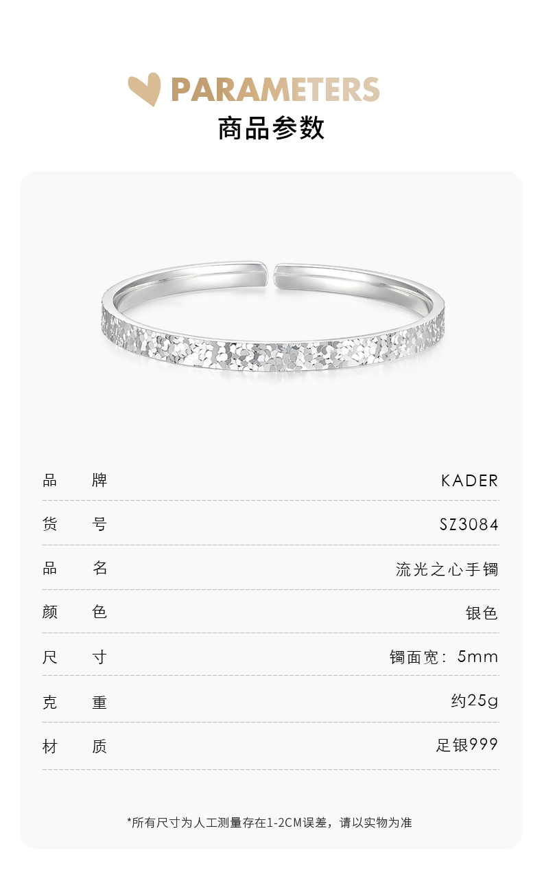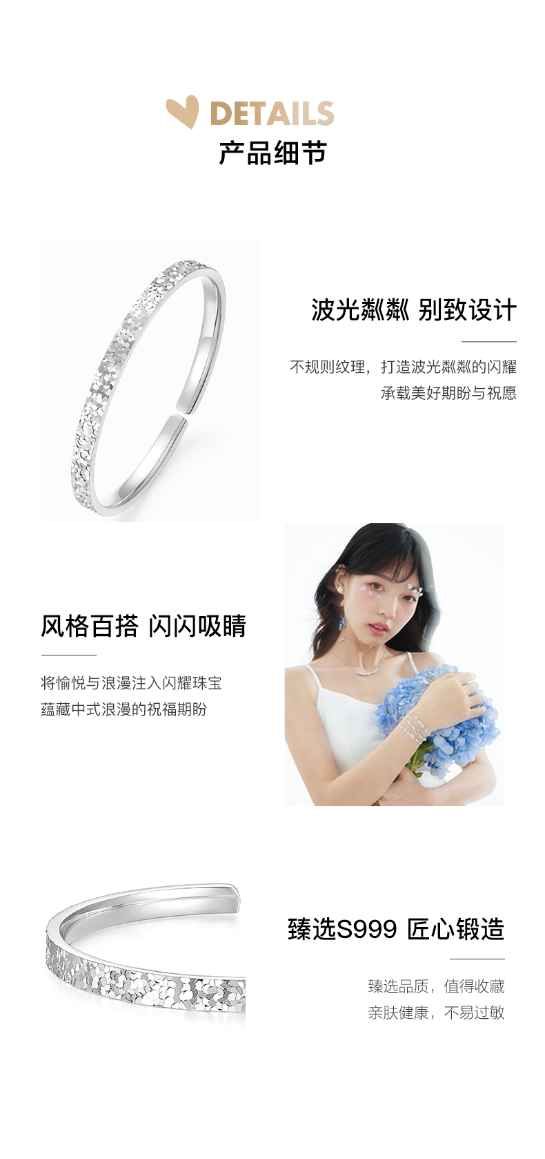 卡蒂罗/KADER 流光之心手镯 999足银波光粼粼轻奢别致时尚开口可调节碎银素圈银镯 简约百搭精致配饰 520女友 礼盒