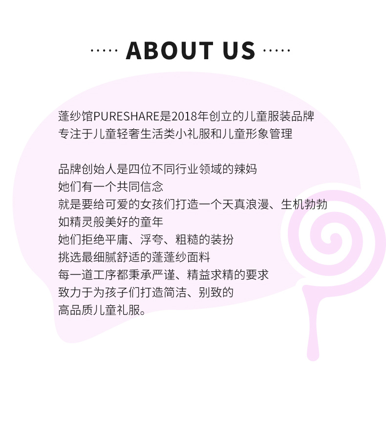 PureShare蓬纱馆,2018年创立的儿童服装品牌,专注于儿童轻奢生活类小礼服,主张“让孩子做最独特的自己”的品牌理念,为孩子们提供时尚简洁、优雅而又不失童真的生活类礼服。