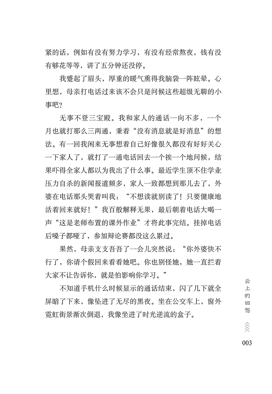 果然,母亲支支吾吾了一会儿突然说:“你外婆快不行了,你请个假回来看看她吧。你也别怪她,她一直拦着大家不让告诉你,就是怕影响你学习。”
