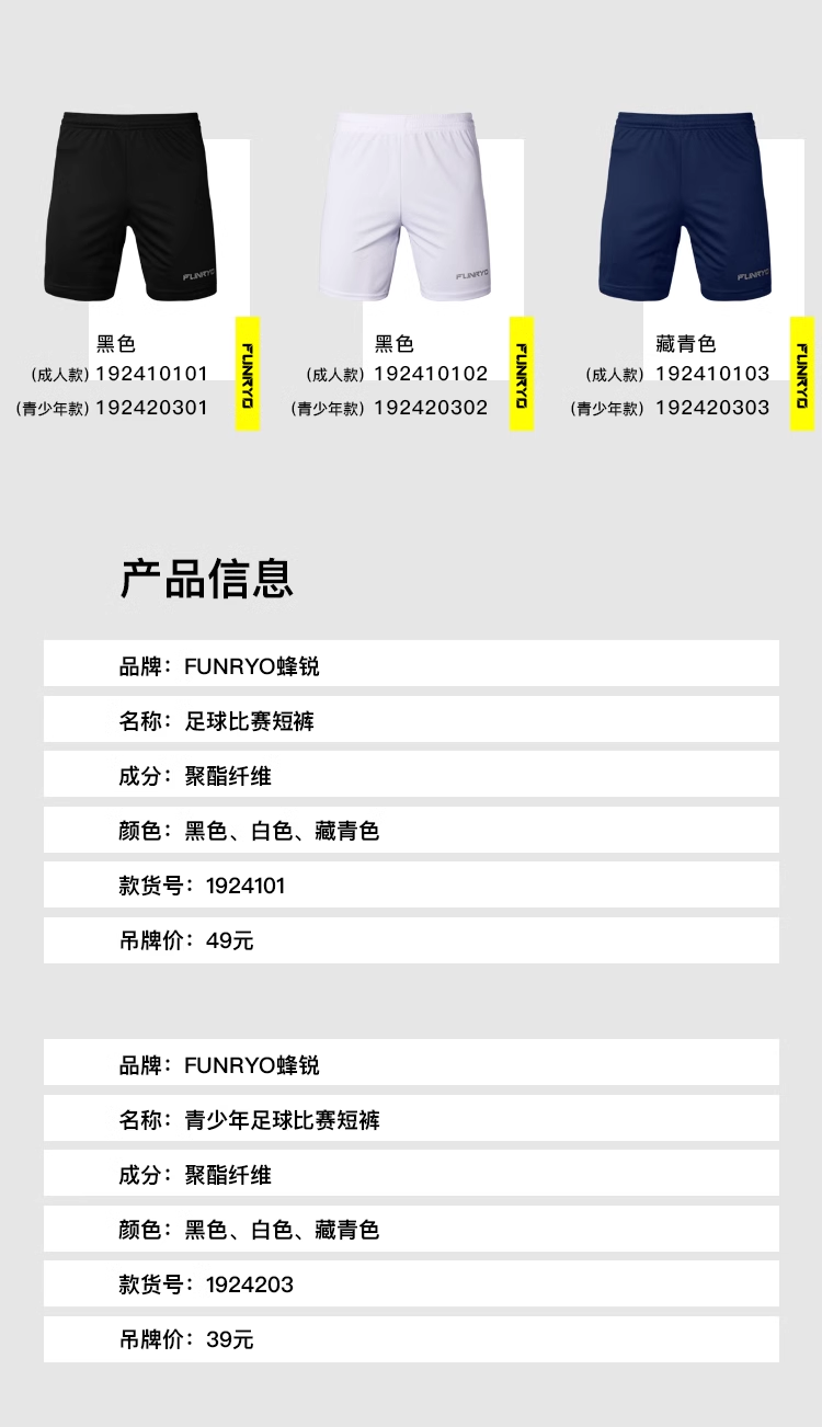 蜂锐FUNRY足球运动比赛成人青少年组队短裤透气训练裤运动裤