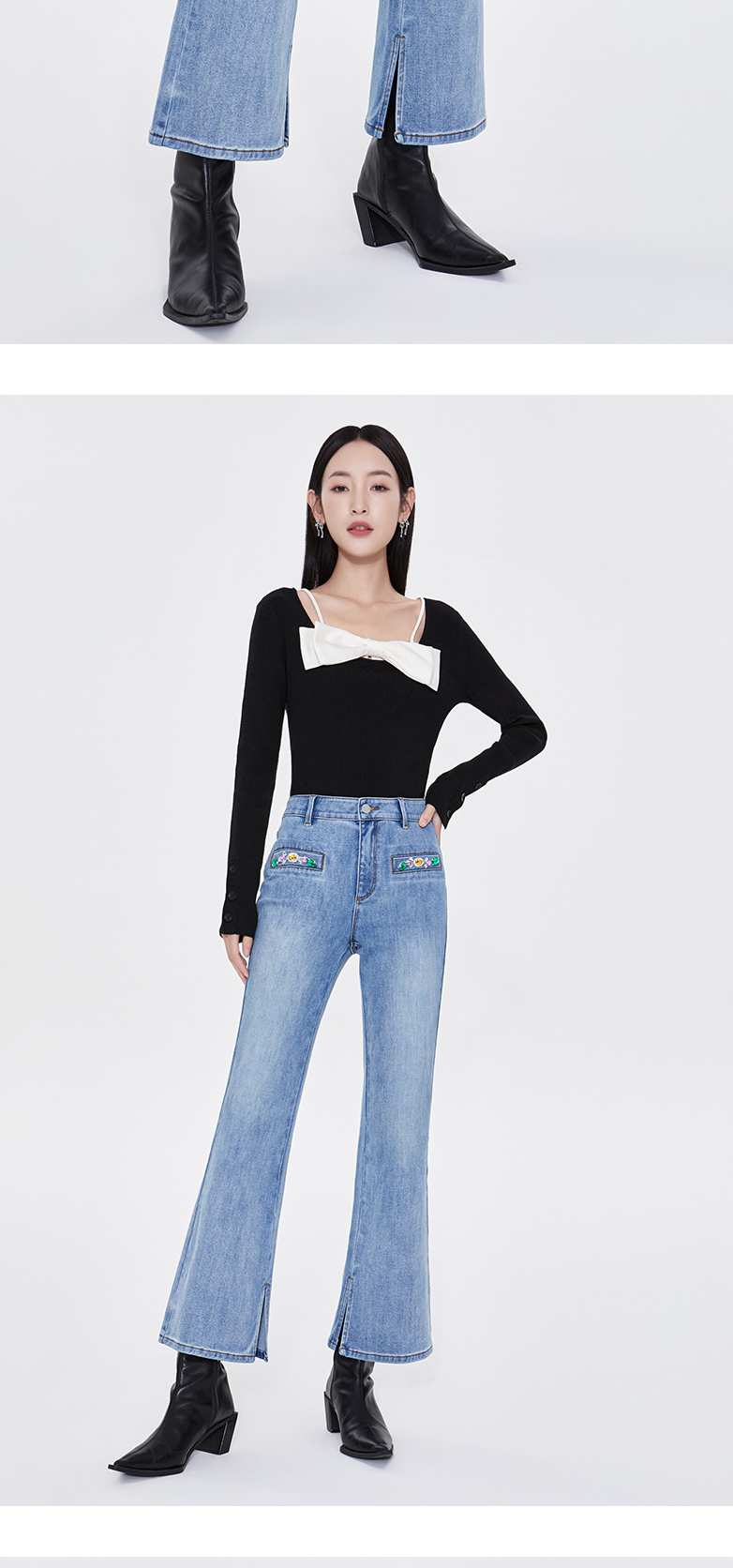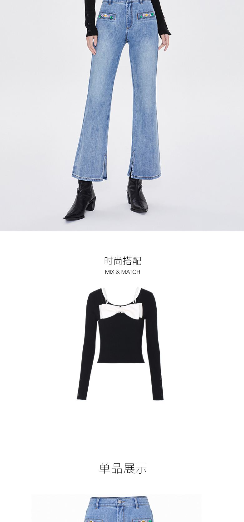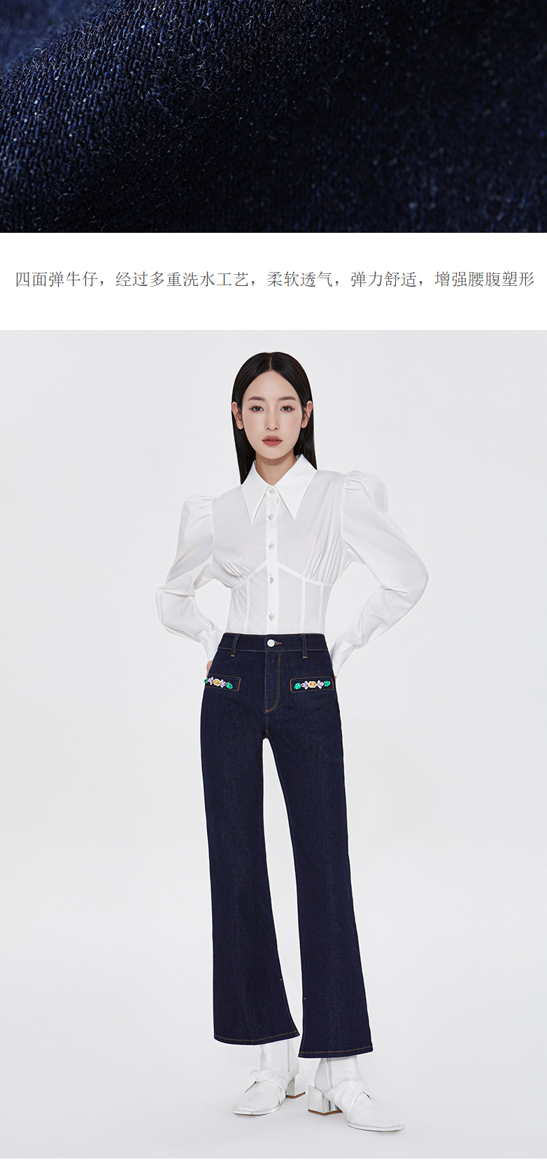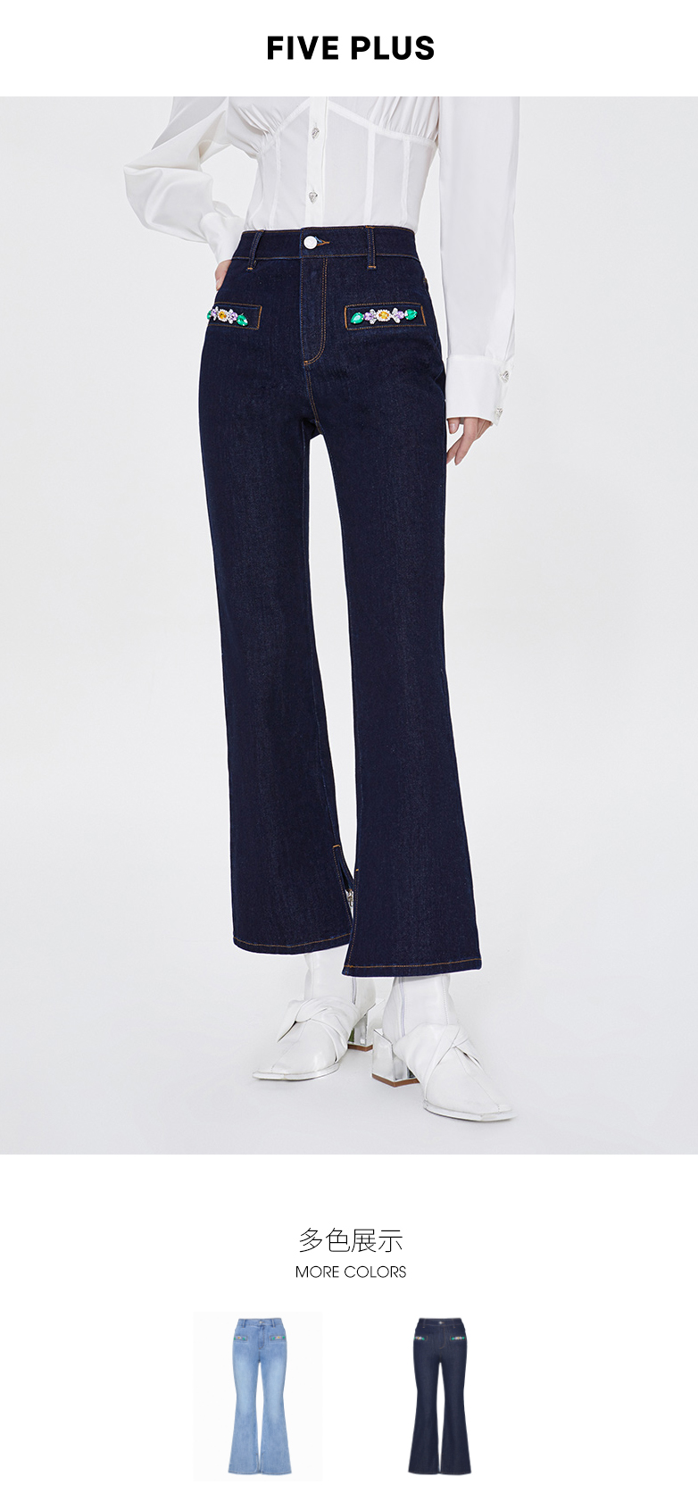 FIVE PLUS新款女春装四面弹牛仔长裤女洗水复古喇叭裤子开叉2WA1062170