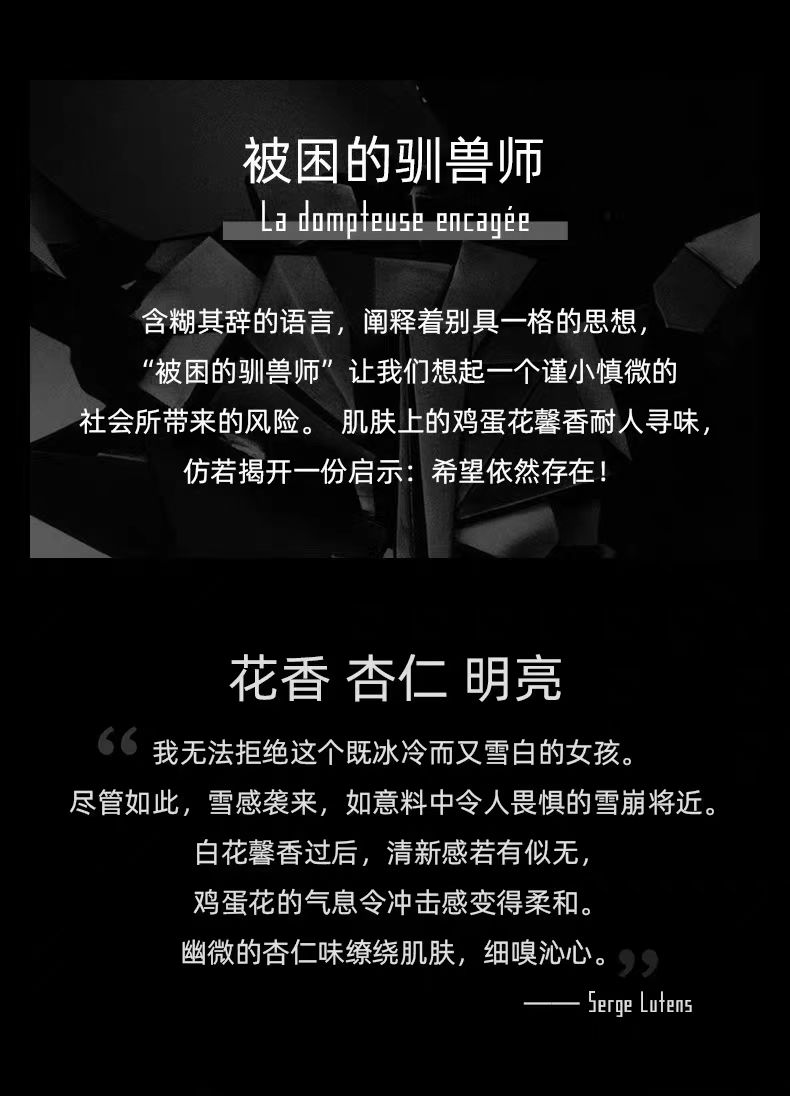 容量: 50ml/100ml 重量: 0.20KG/0.37KG 男女皆宜的花香调香水 充滞热带风情和甜美愉快 包含鸡蛋花、杏仁和依兰依兰香调 于2021年推出 适合春夏使用 |