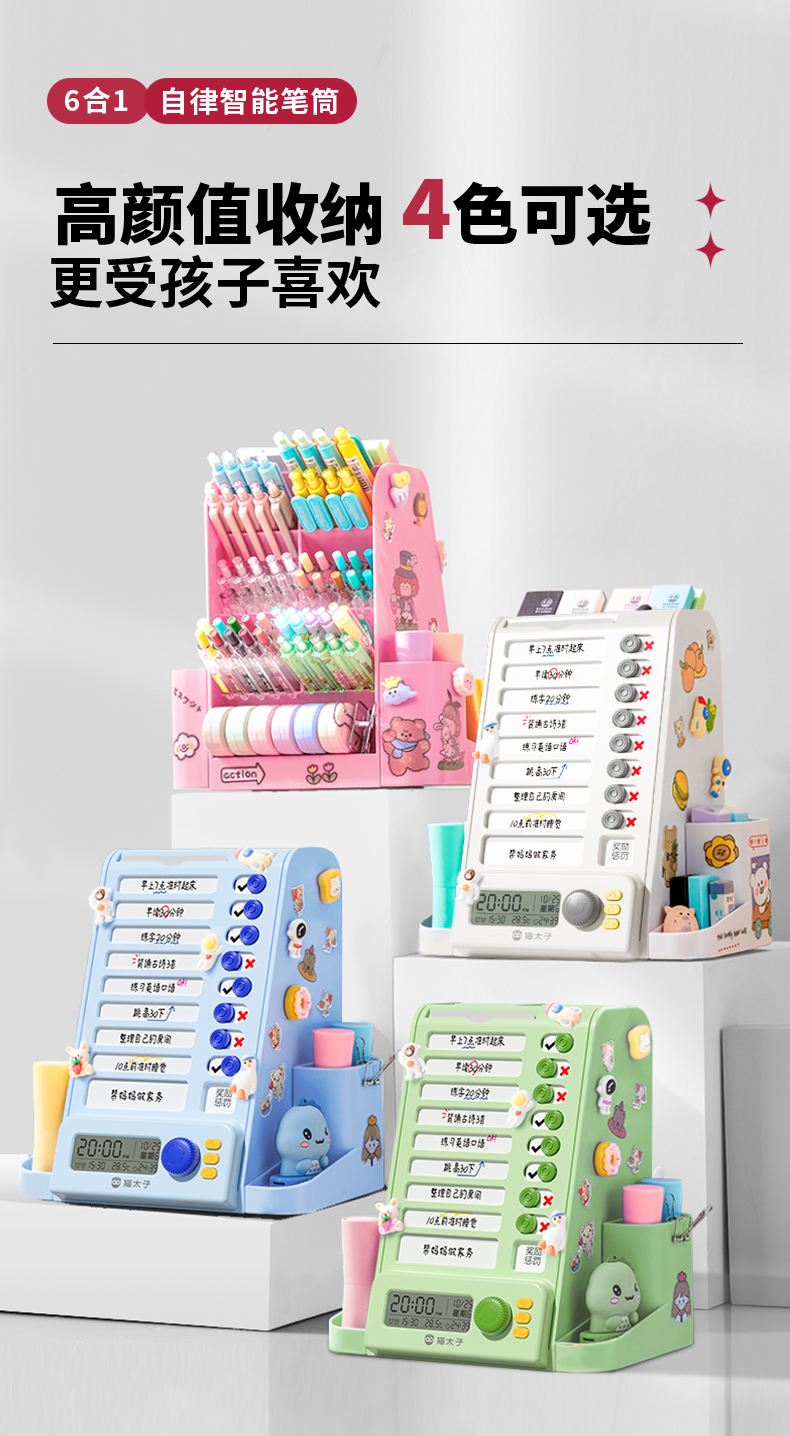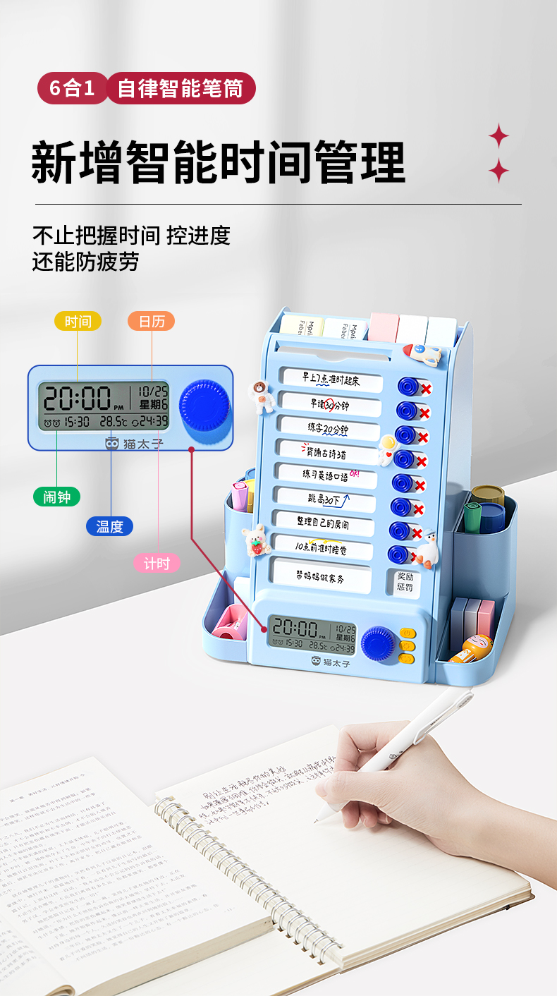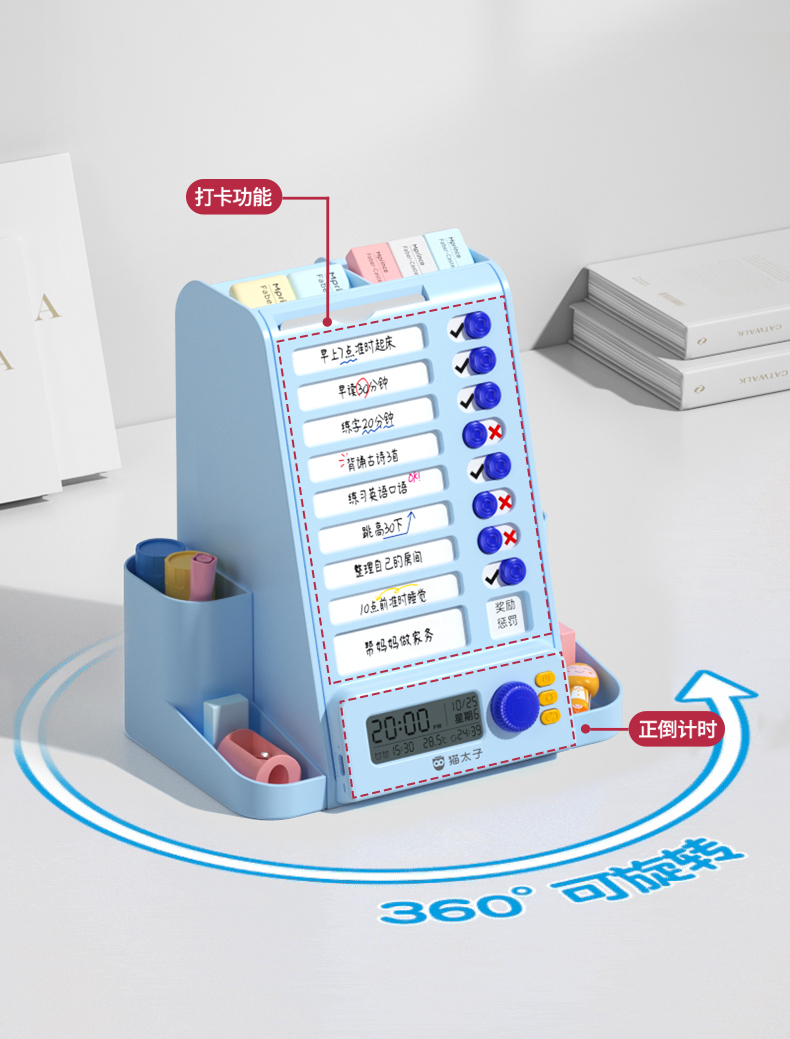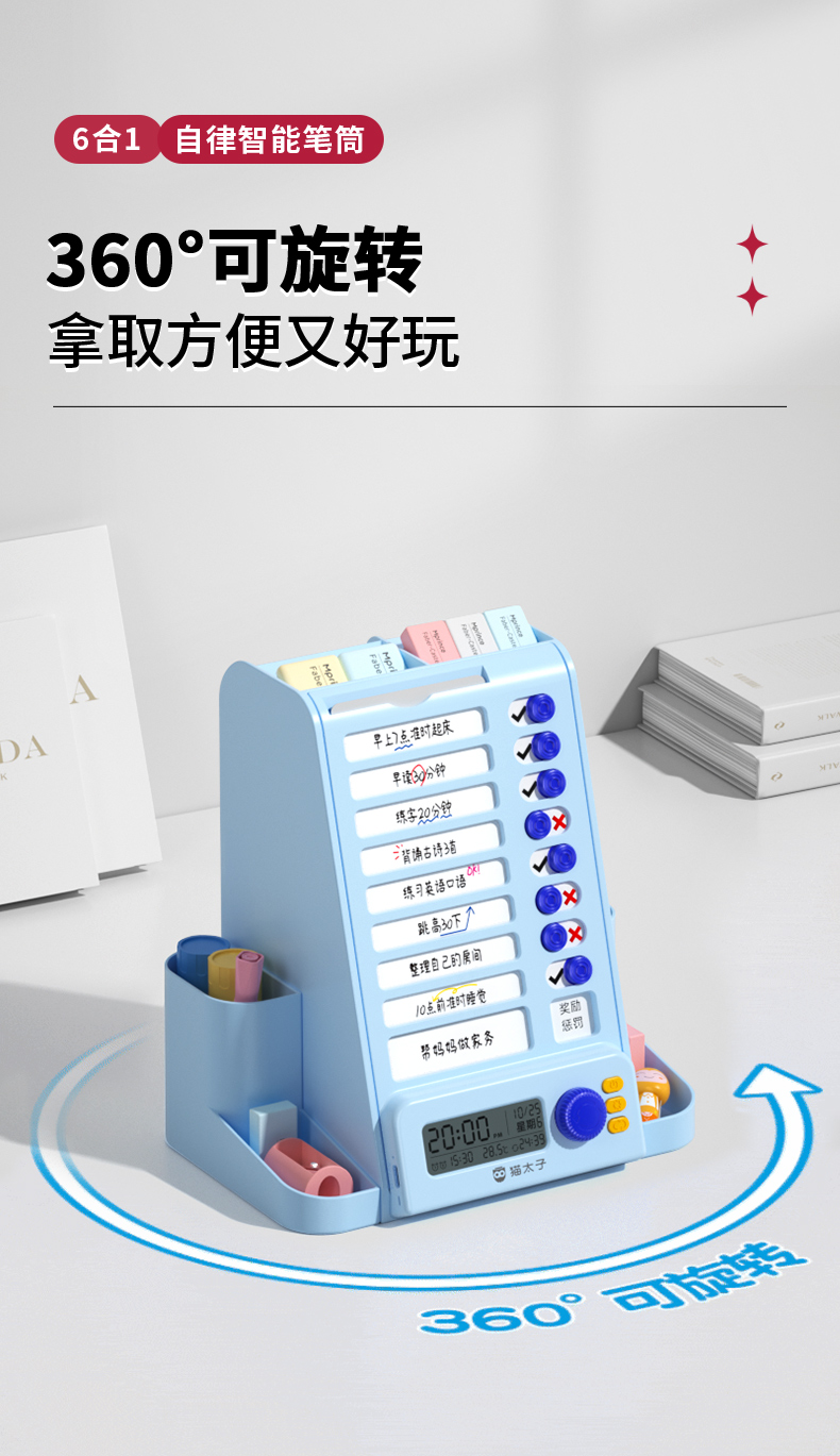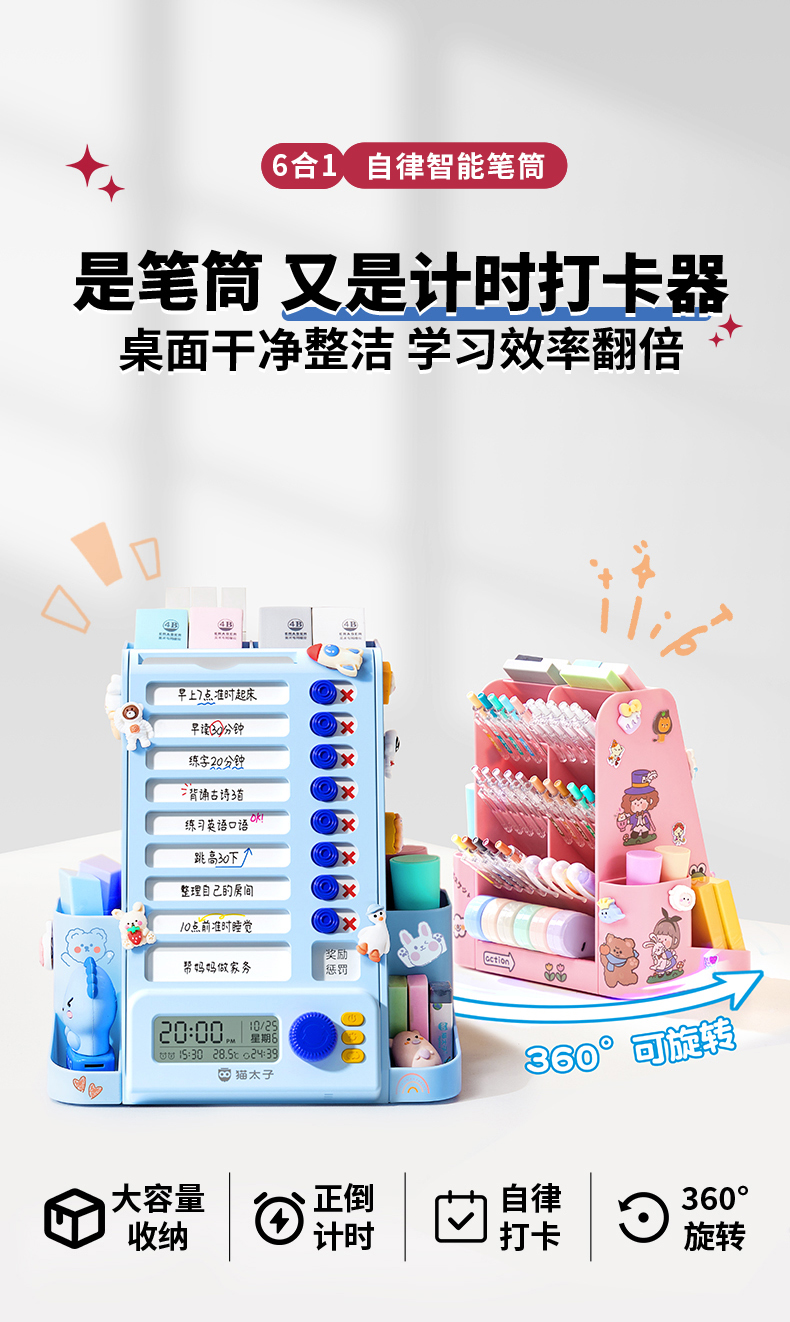 猫太子自律旋转笔筒大容量学生桌面多功能收纳笔盒儿童男女孩文具超大笔桶打卡器创意高颜值轻奢高级感暑假