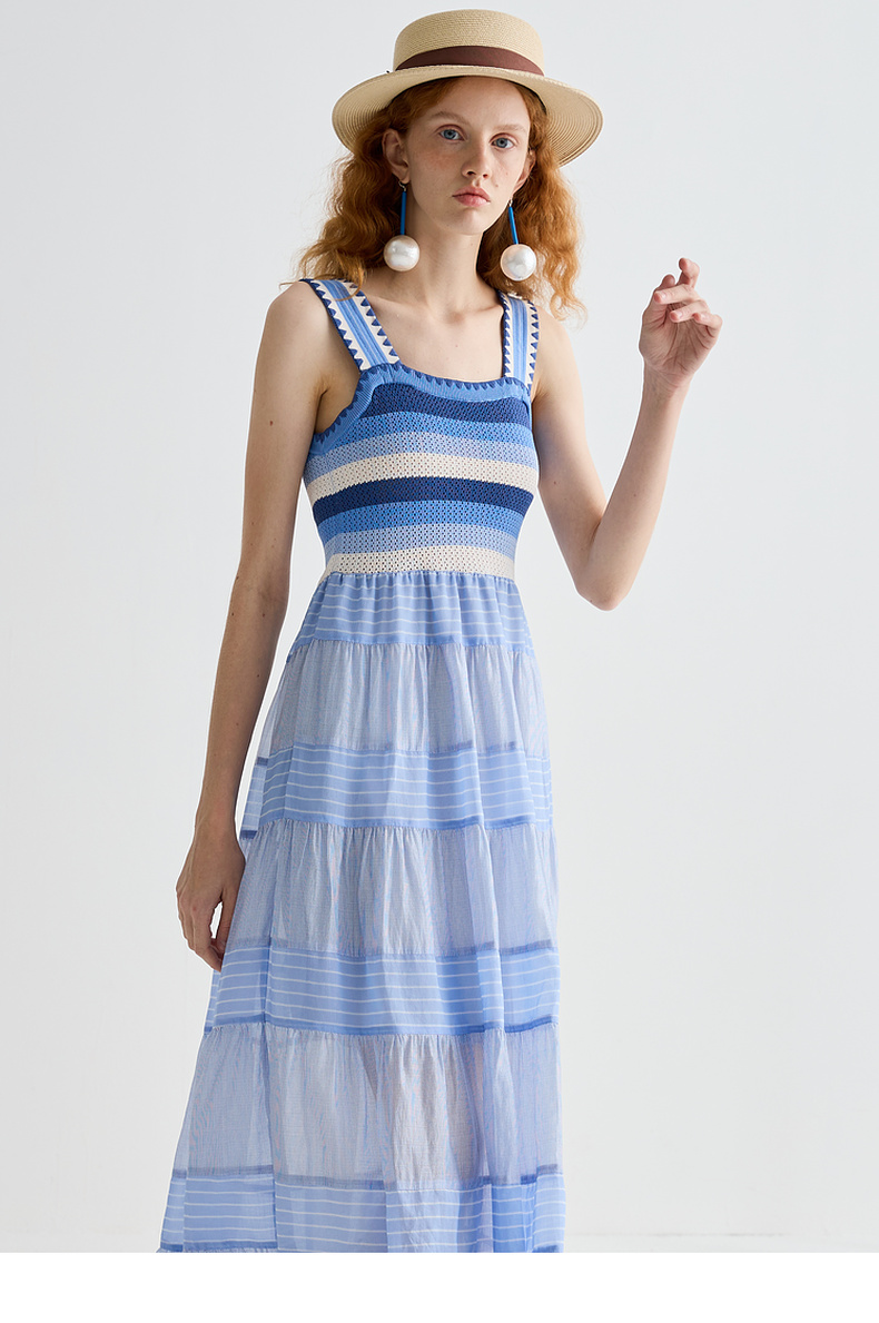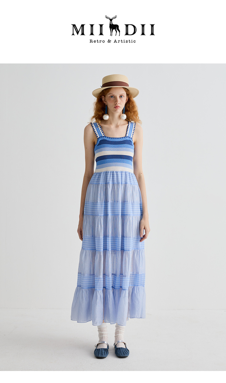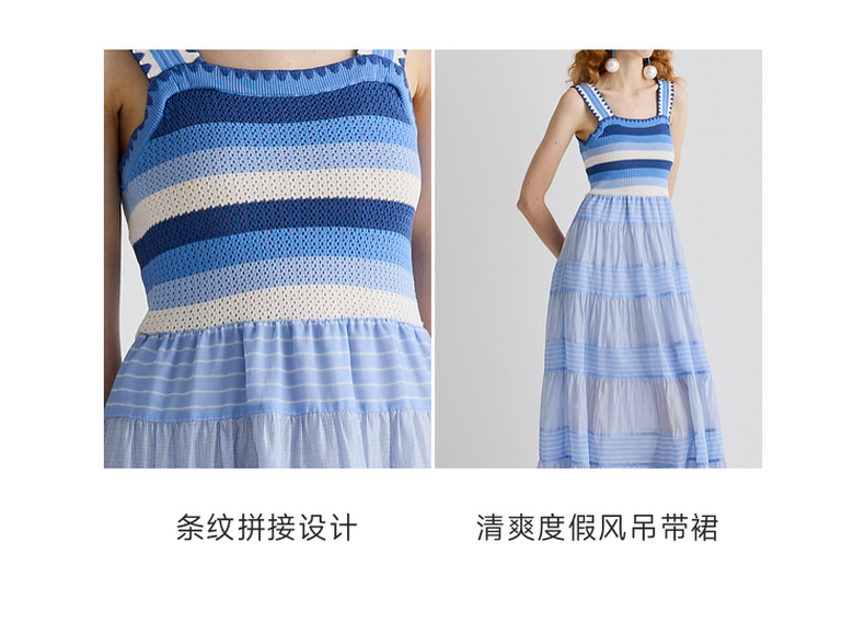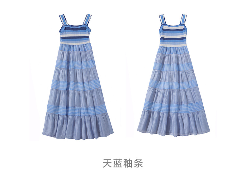 谜底连衣裙无袖女2025夏季新品度假蓝条纹紧身吊带长裙252ML0681