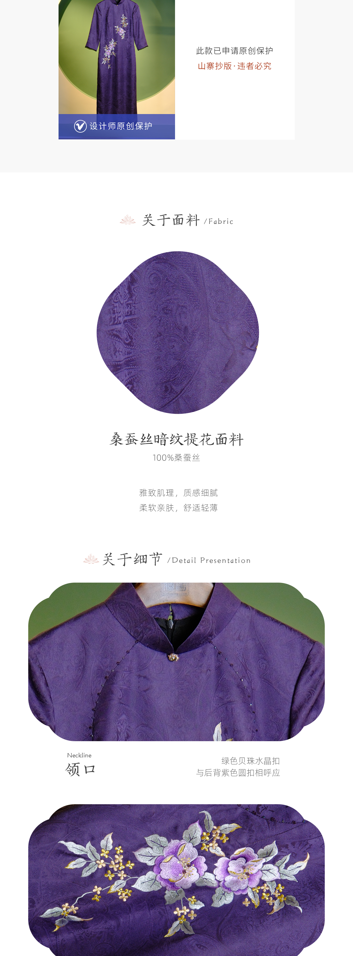 荷言HEYEN 紫气东来 桑蚕丝提花旗袍山茶桂花刺绣紫黑水晶
