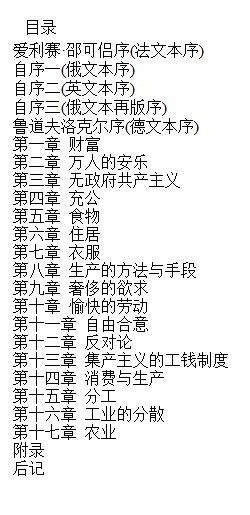 爱利赛•邵可侣序(法文本序) 自序一(俄文本序) 自序二(英文本序) 自序三(俄文本再版序) 鲁道夫•洛克尔序(德文本序) 第一章 我们的财富 第二章 万人的安乐 第三章 无政府共产主义 第四章 充公 第五章 食物 第六章 住居 第七章 衣服 第八章 生产的方法与手段 第九章 奢侈的欲求 第十章 愉快的劳动 第十一章 自由合意 第十二章 反对论 第十三章 集产主义的工钱制度 第十四章 消费与生产 第十五章 分工 第十六章 工业的分散 第十七章 农业 附录 后记