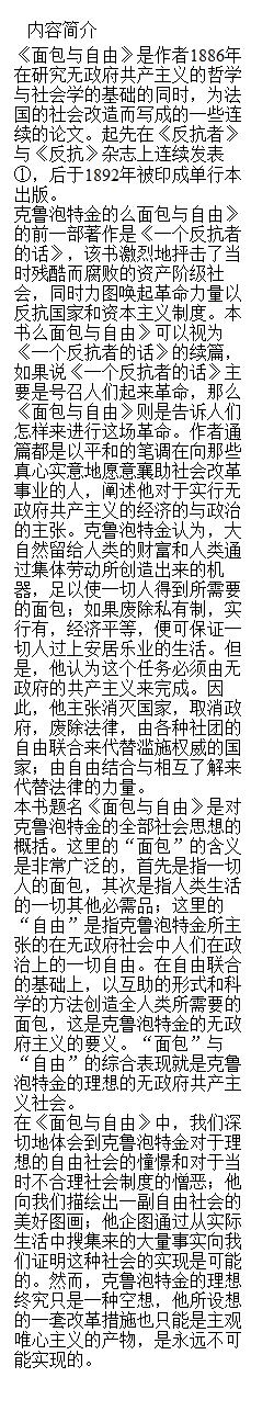 《汉译世界学术名著丛书:面包与自由》是作者克鲁泡特金在1886年,就法国社会改造而写的。他从政治、经济的角度,批判了现实社会制度,对代议制、法律、强权等,进行了分析与抨击。同时提出无政府共产主义的经济与政治主张——若废除私有制,实行有、经济平等,消灭国家,取消政府,废除法律,由各种自由联合的社团代替强权的国家,由社团成员的自由意志,代替法律的力量,以互助的形式和科学的方法提高社会劳动生产等。