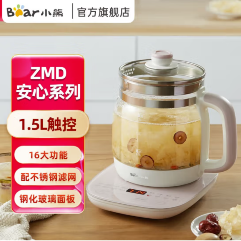 小熊(Bear)养生壶 煮茶器 煮茶壶电水壶烧水壶1.5L触屏玻璃花茶壶【ZMD安心系列】 YSH-A15Z8 淘气
