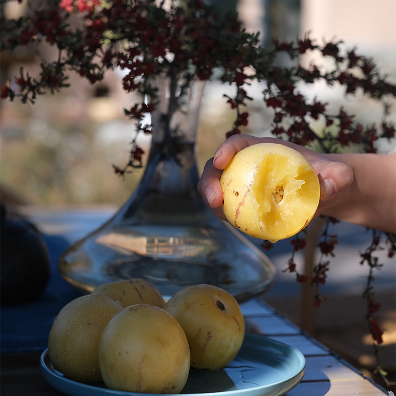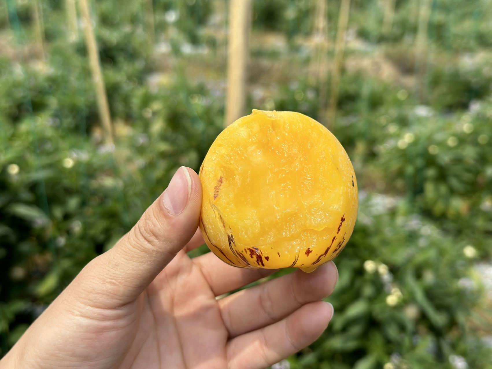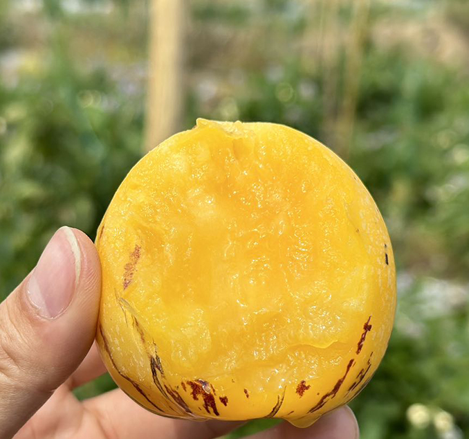 而我们坚持只发树上自然熟的果子,果面金黄 紫色条纹明显 果肉泛黄散发着阵阵清香,一口咬下去果汁飞溅 奶香味瞬间在唇齿间散开,回味无穷 越吃越想吃。