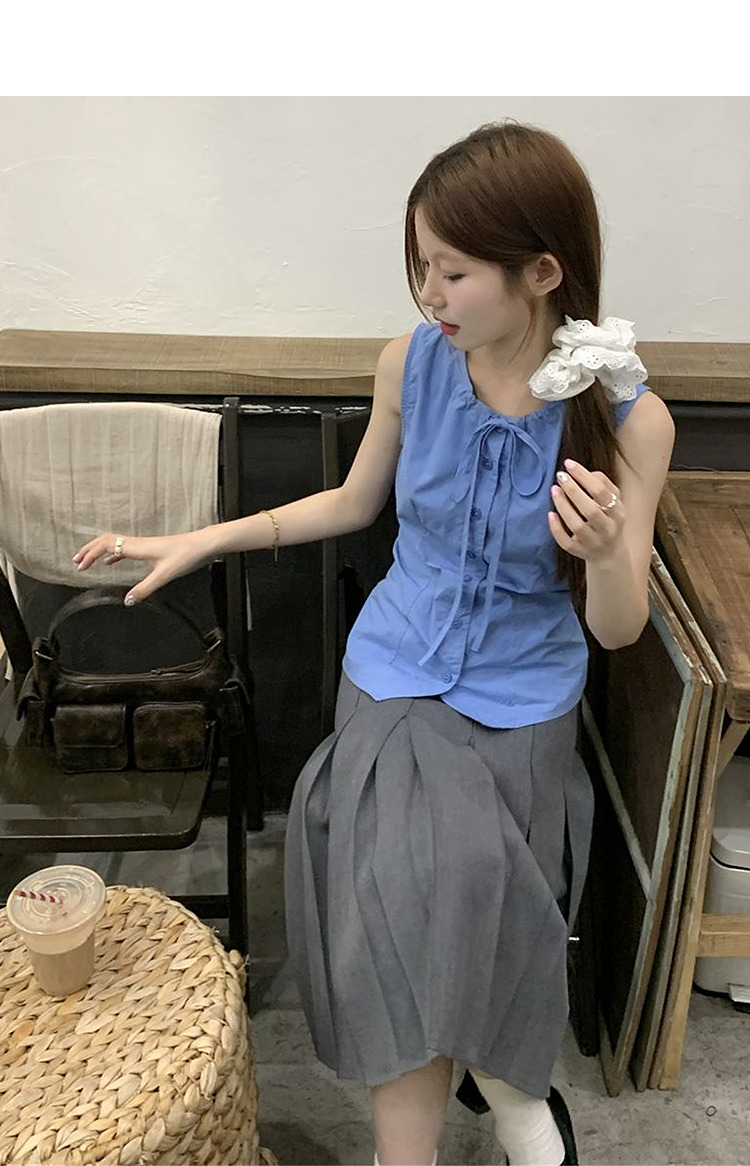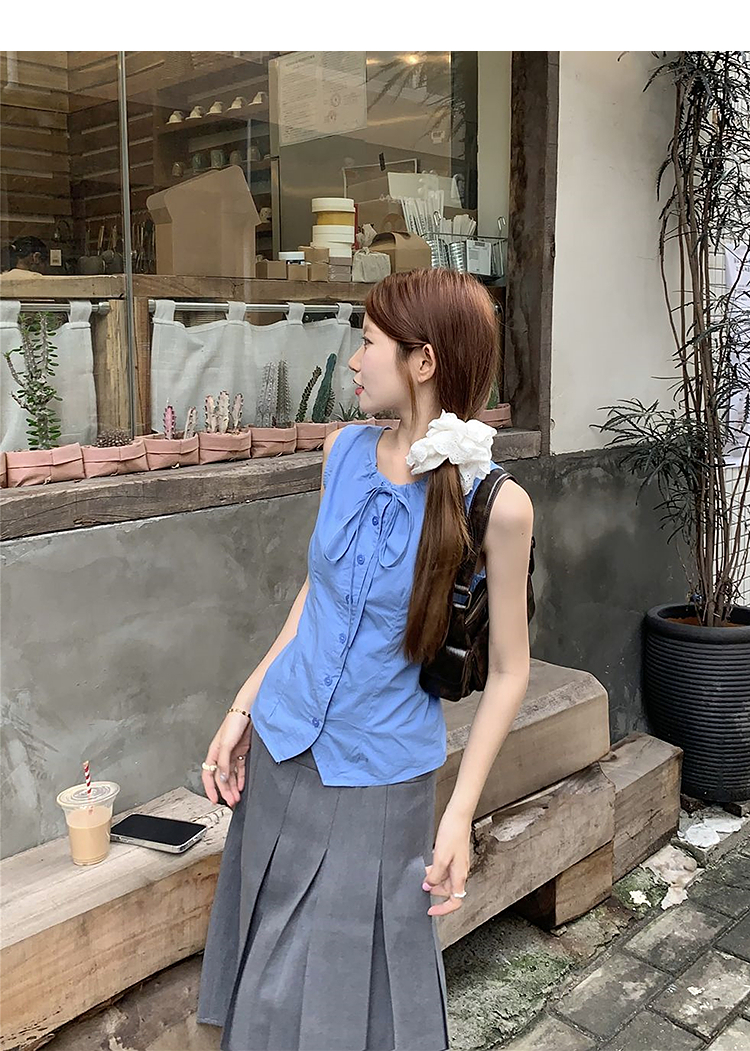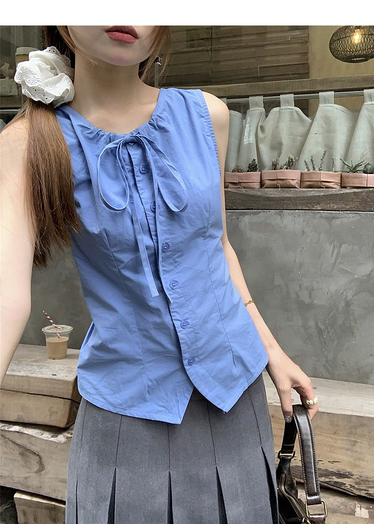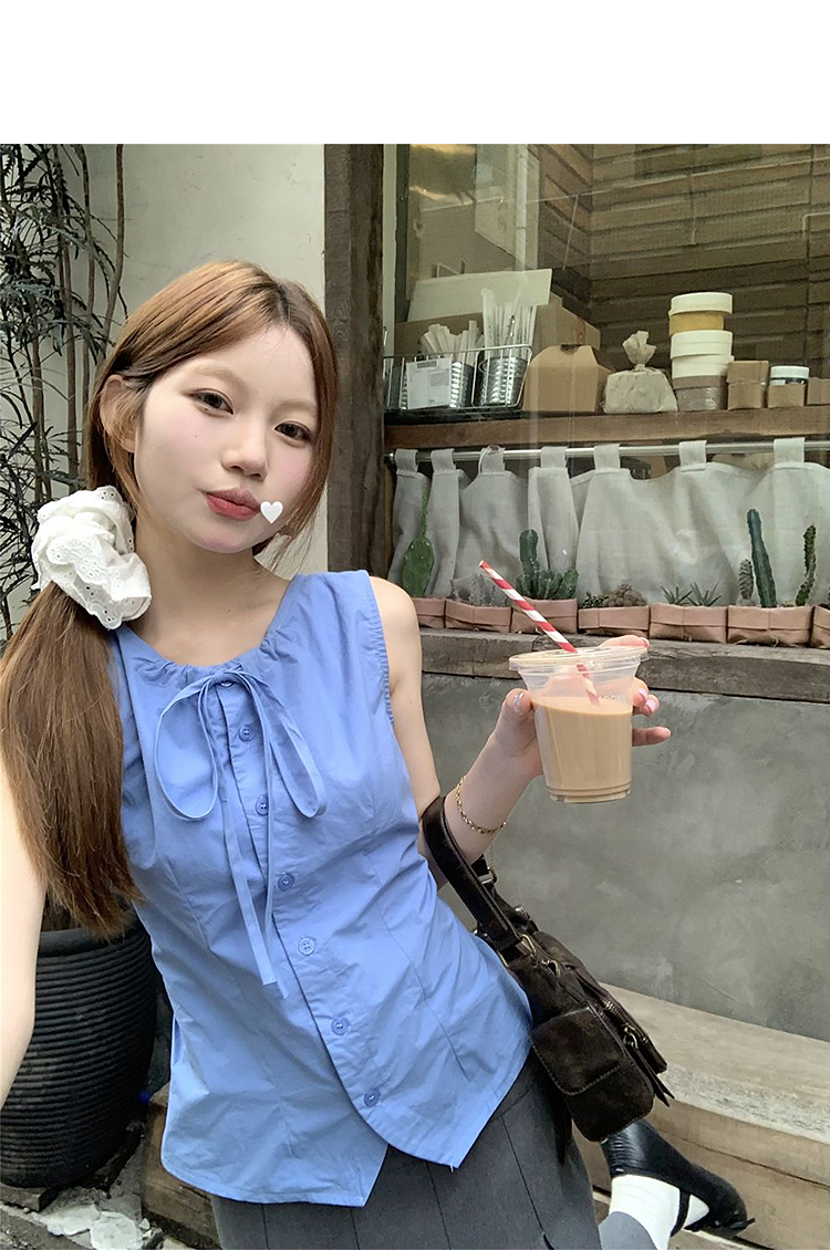 西遇蓝色无袖衬衣女夏季新款系带蝴蝶结薄款圆领衬衫上衣SS050615