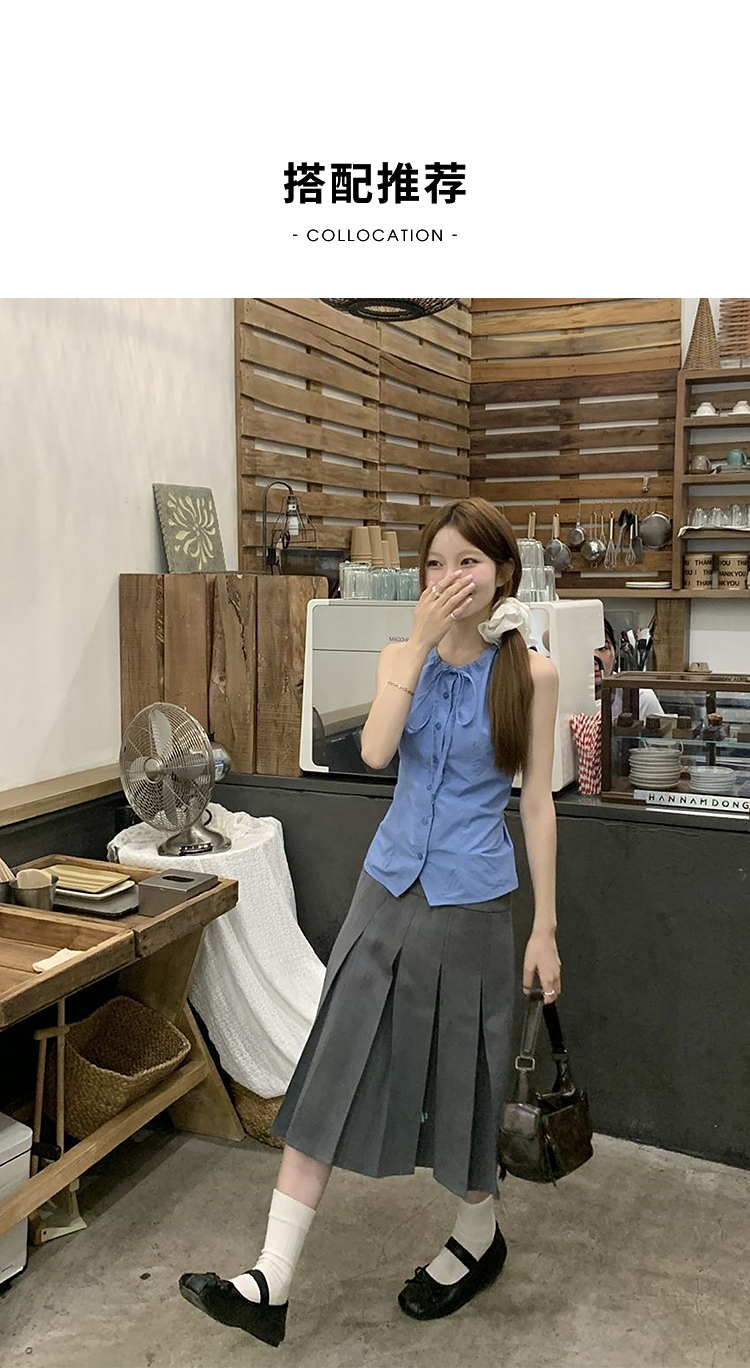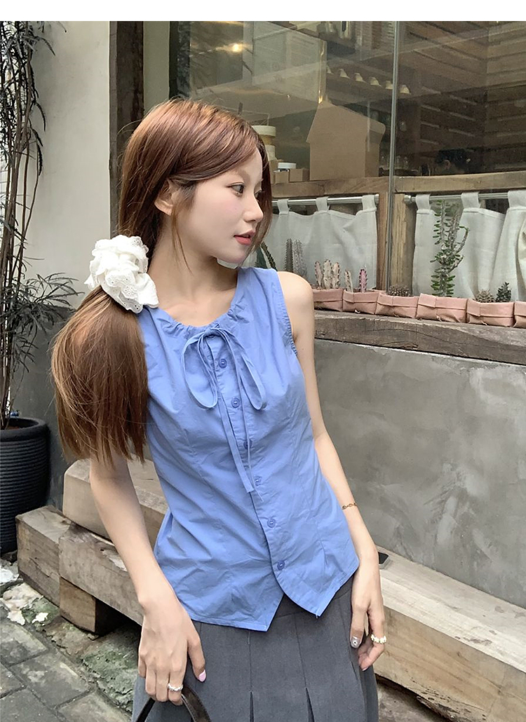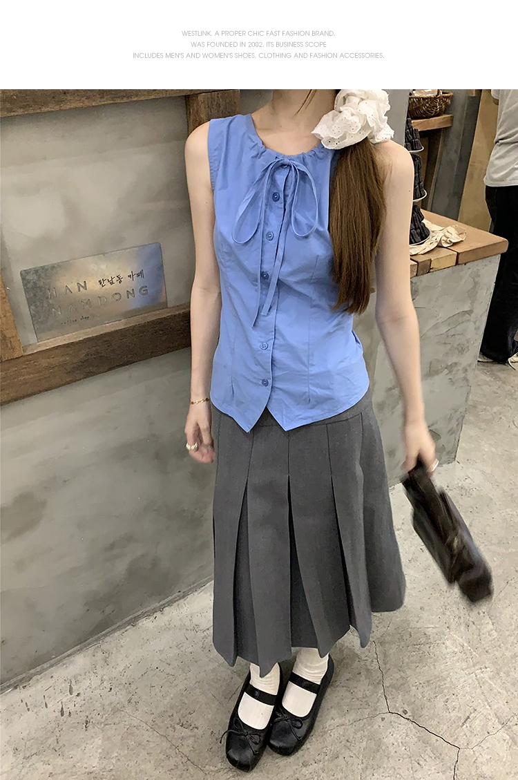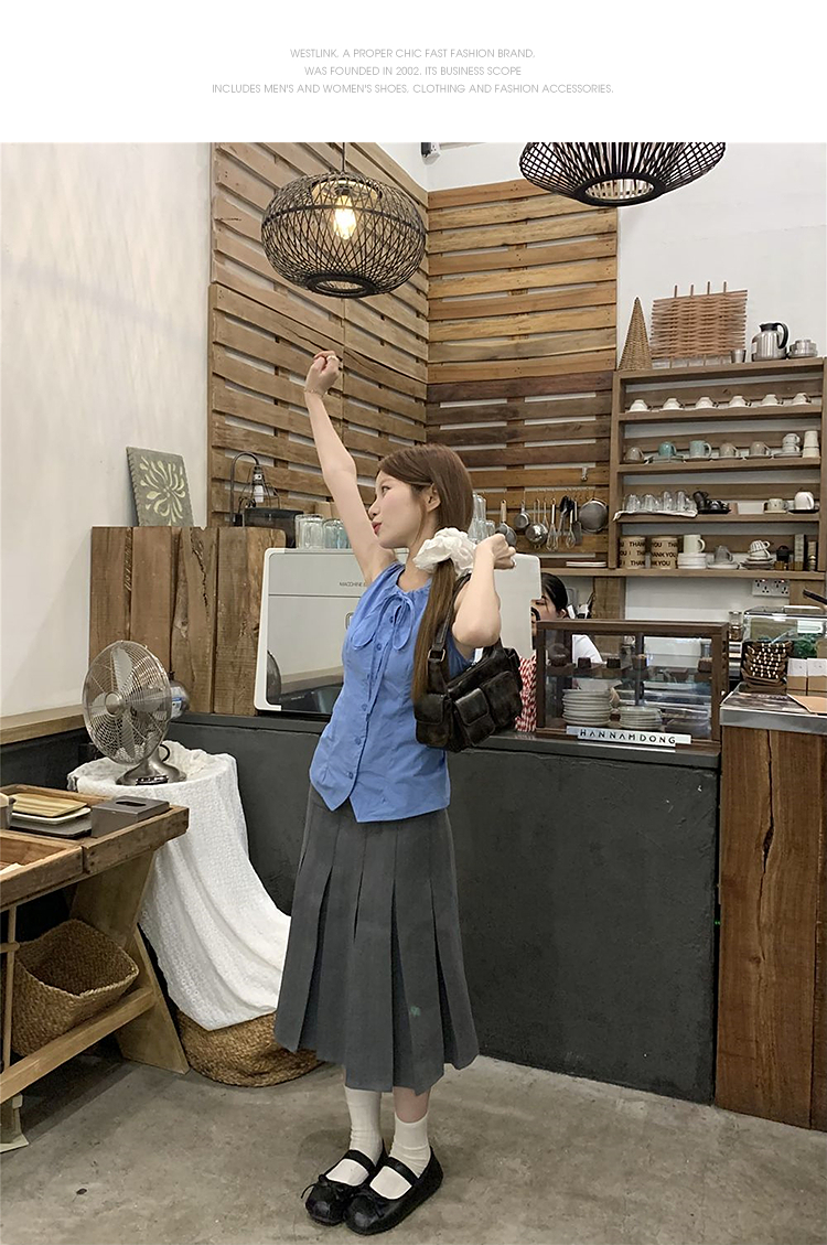 西遇蓝色无袖衬衣女夏季新款系带蝴蝶结薄款圆领衬衫上衣SS050615