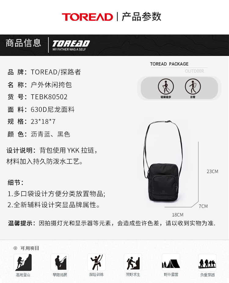 探路者挎包22春夏新款户外男女通用耐磨双层拉链单肩包TEBK80502