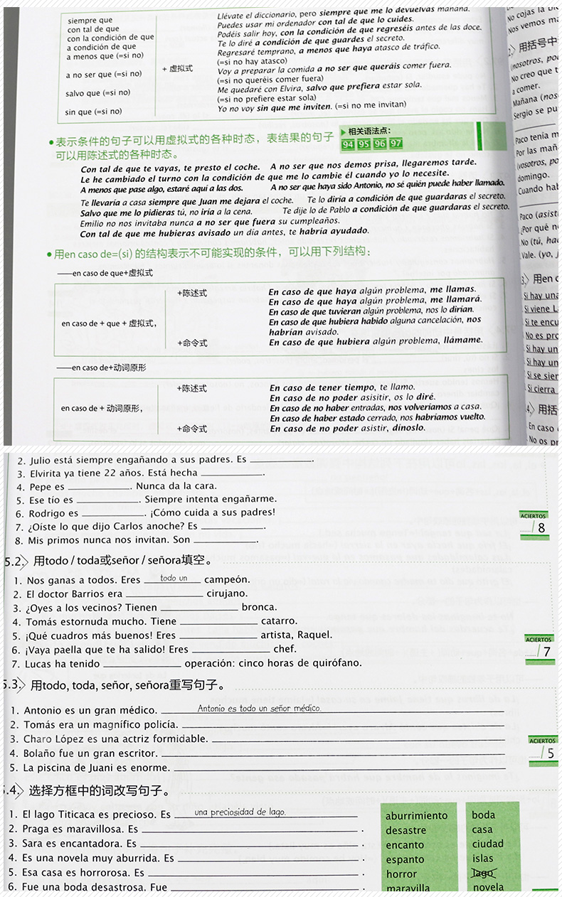 内容简介《标准西班牙语语法——精解与练习(高级)》为标准西班牙语语法系列中的一本,由西班牙原版引进,知名老师编译。根据塞万提斯学院课程计划的参考标准,《标准西班牙语语法精解与练习(高级)》适合高级(C1-C2)水平的西班牙语专业学生及广大西班牙语爱好者。标准西班牙语语法精解与练习系列*的特点是理论与练习紧密结合,理论部分深入浅出地讲解语法点,配有场景图片和大量例句,此外,每讲后还配有相关语法点练习,使学生能做到马上检验学习成果。