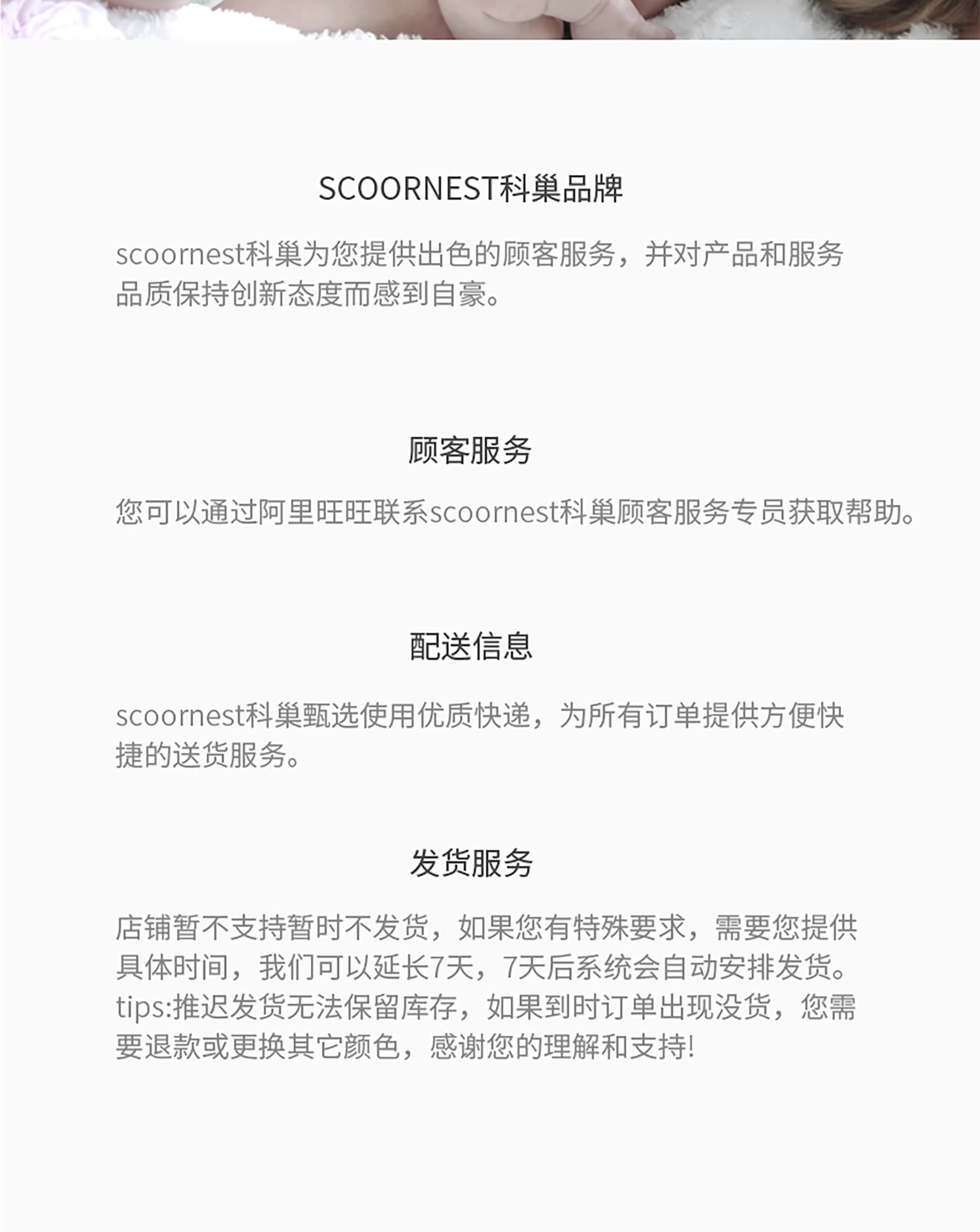 - Scoornest始终秉承给每一位宝宝送去科学的、关心的、创新的成长体验,通过提供商品和服务,使顾客形成守护、发展、巩固这种弥足珍贵的亲情的爱。