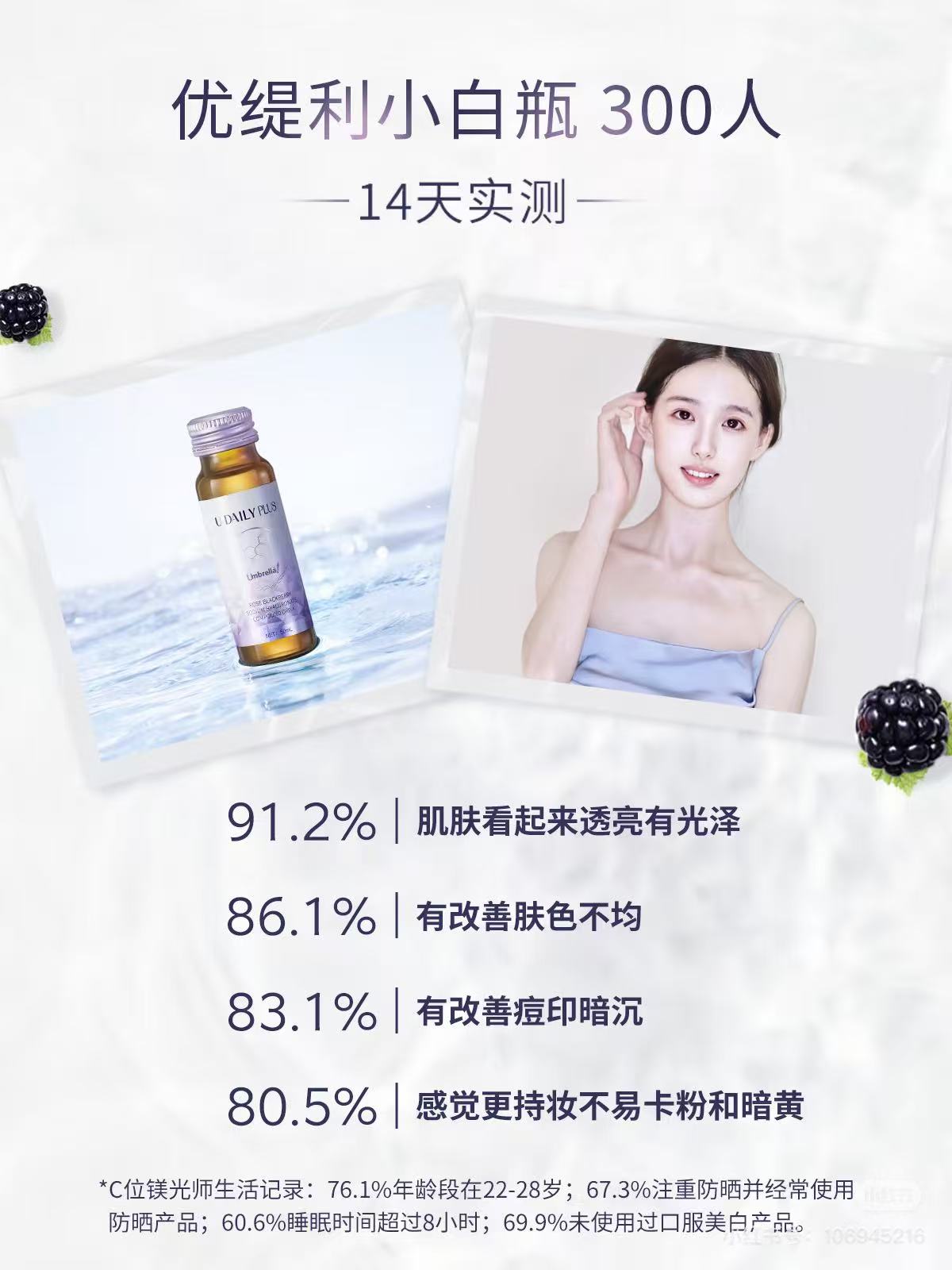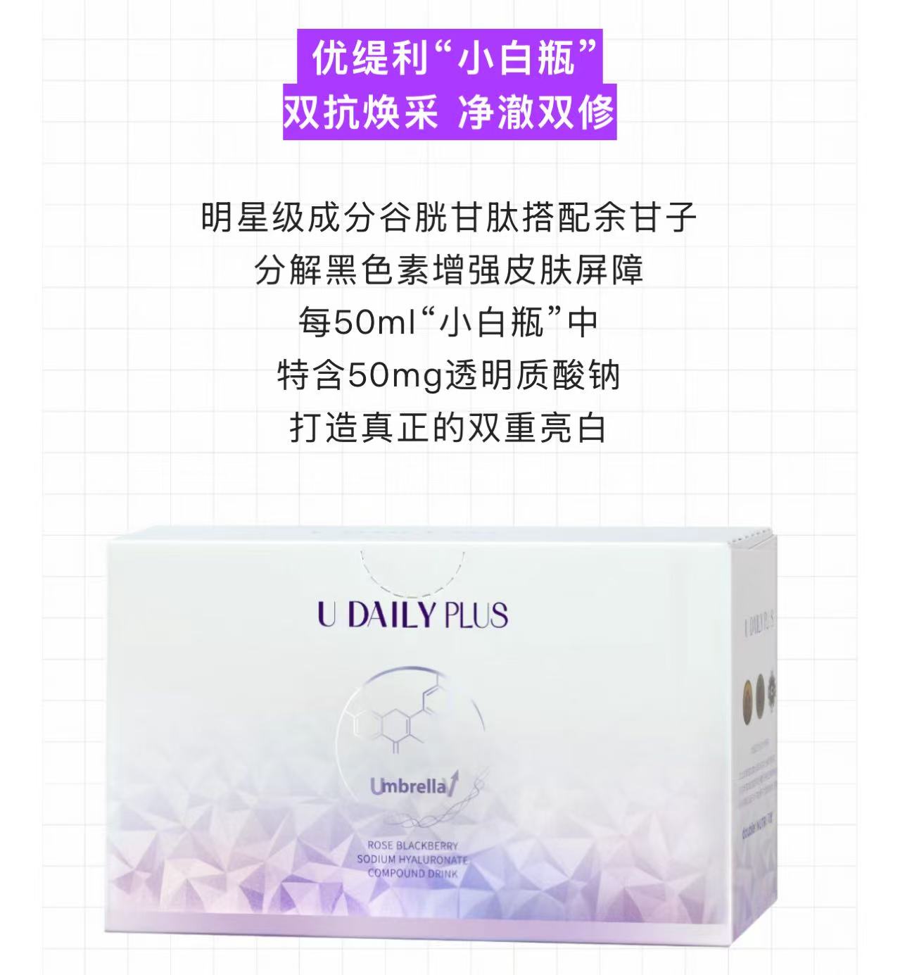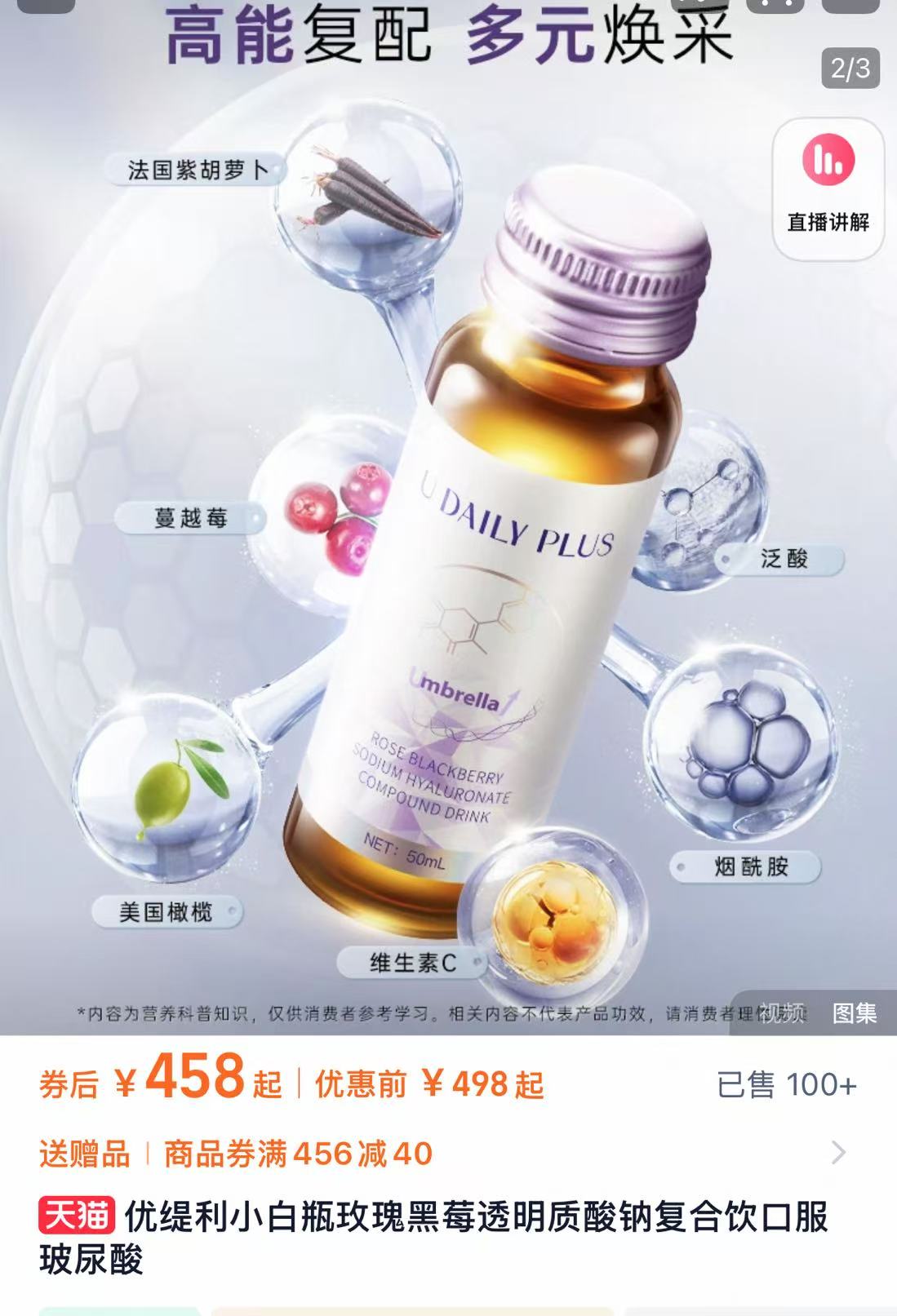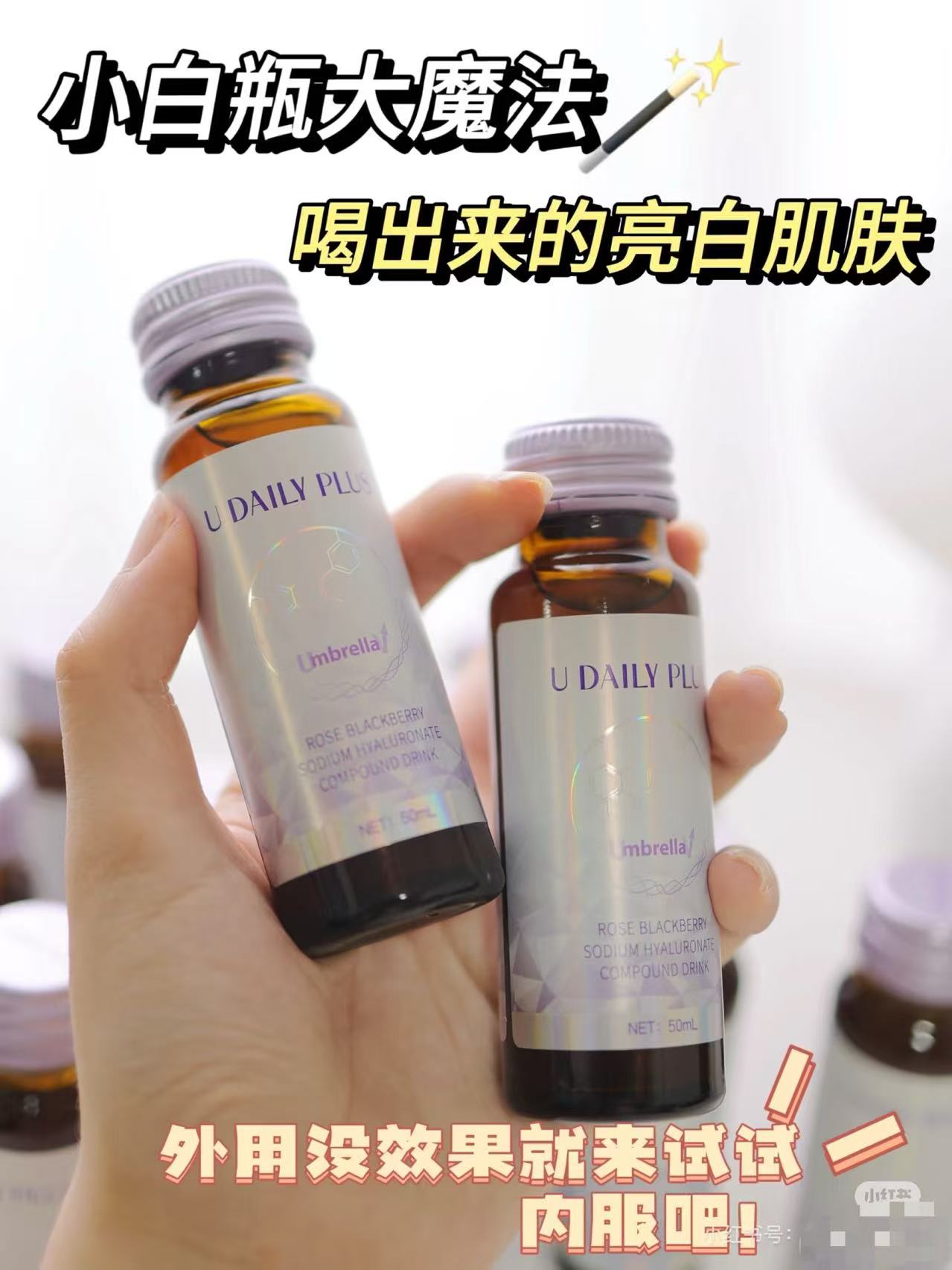 优缇利玫瑰黑莓透明质酸钠液态饮品(简称为“小白瓶”)和优缇利雪莲胶原蛋白肽液态饮品(简称为“小优瓶”),