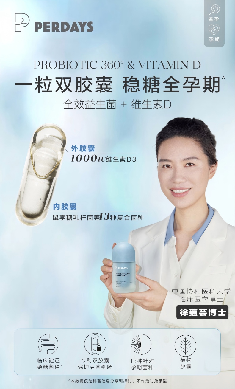 PERDAYS孕期控糖锁养双胶囊益生菌+维生素D30粒*1瓶