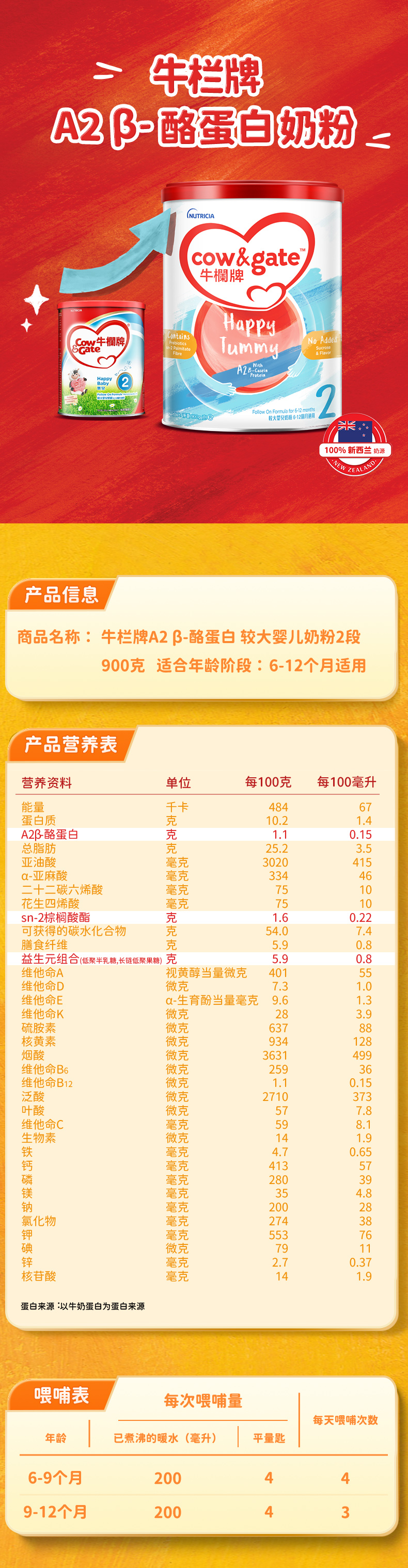 牛栏牌Cow & Gate 港版Happy Tummy婴幼儿β-酪蛋白配方奶粉2段(6-12个月) 900g