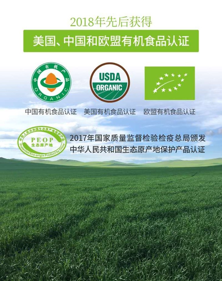 2. 中国唯一一家拥有原生态原产地保护产品的品牌。中国、美国、欧盟三大机构有机认证,权威更有保障!
