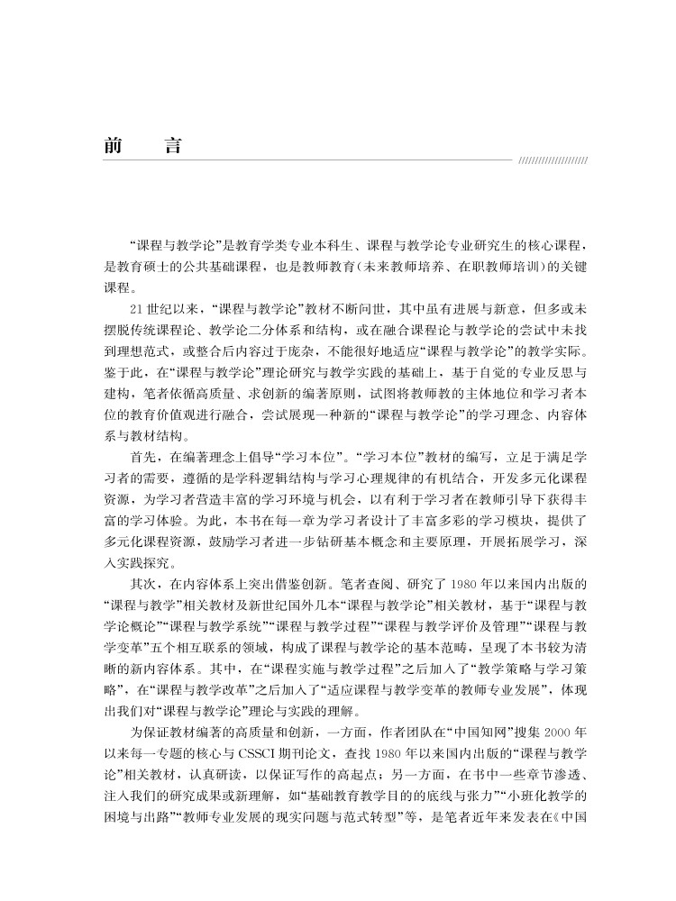本书以国家最新教育政策、课程思政理念、学科发展前沿为引领,以学科融合的视角,构建课程与教学论概述、系统、过程、评价管理与改革发展“五维一体”的内容结构。基于学习本位的理念,本书呈现了体系化的阐述与实践分析、丰富的文献材料与实践案例、时代理解与原典论述,强化教材的引导性与交互性,为读者提供清晰的理论地图与丰富的学习支持。本书既可作为高校教育学相关专业本科生、研究生的教材,又可作为中小学教师与管理者进行理论研究和实践创新的参考。