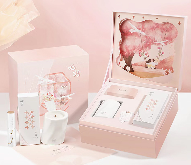 拆开礼盒的过程也有满满的仪式感,待细绳解开缠绕,映入眼帘的是关于使君子和桃金娘的故事