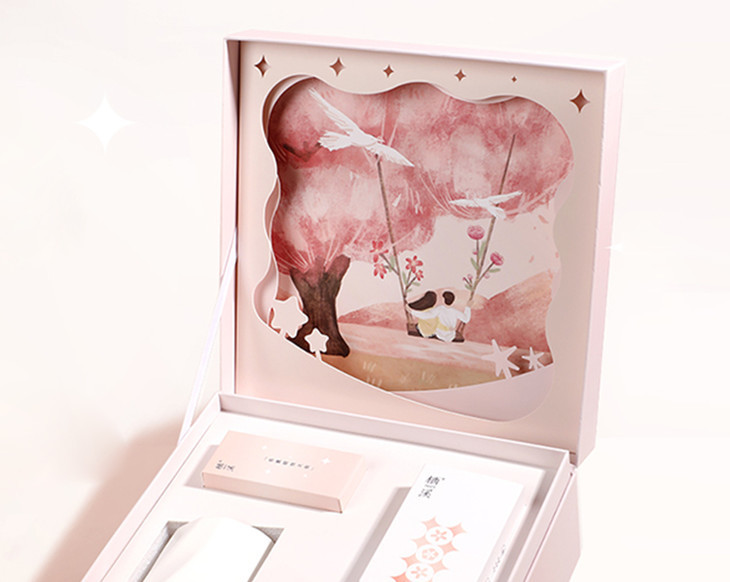 轻启礼盒,窗外风景映入眼帘,远山、树木、秋千上的恋人在窗的裁剪下形成一幅浪漫的画。